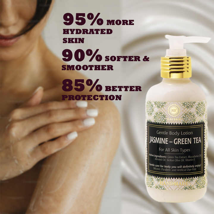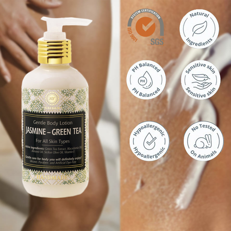 โลชั่นบำรุงผิวทำมือ เป็นมิตรต่อสิ่งแวดล้อม ผลิตในสหภาพยุโรป ขายส่งจำนวนมาก รับผลิตแบบ OEM ODM กลิ่นมะลิและชาเขียว น้ำมันธรรมชาติเนื้อเนียนนุ่ม