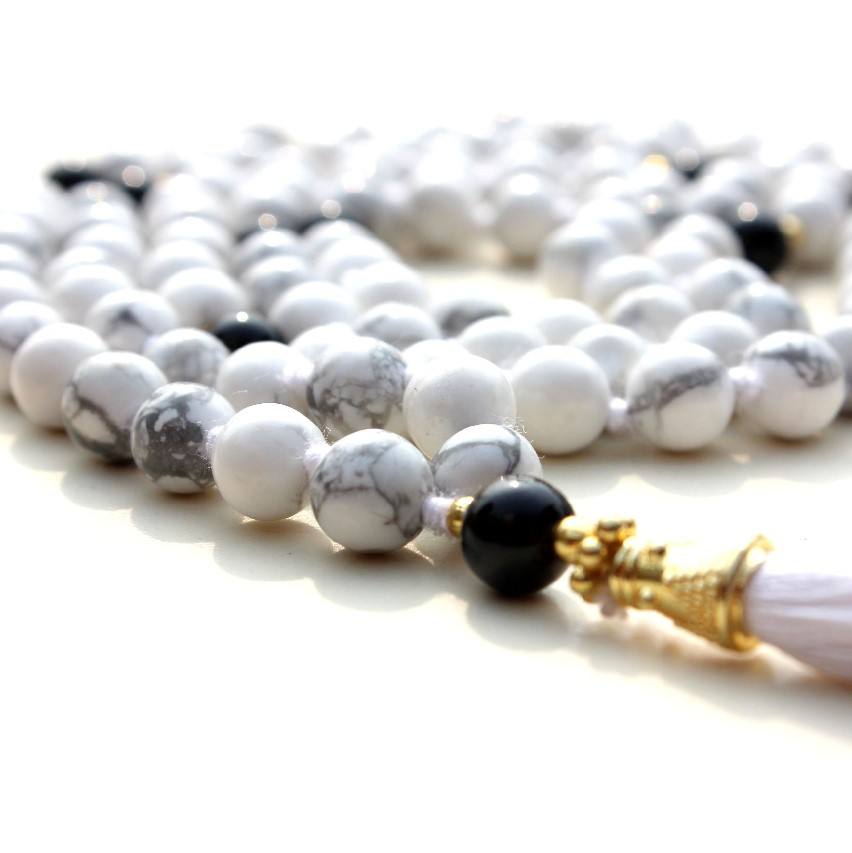 สร้อยคอทำมือสไตล์โบฮีเมียน 108 เม็ด ประดับด้วยลูกปัดอินเดียสำหรับสวดมนต์ ช่วยปรับสมดุลจักระ เหมาะสำหรับผู้ชาย ประดับด้วยหินฮาวไลท์และออนิกซ์ ขนาด 6 มม.