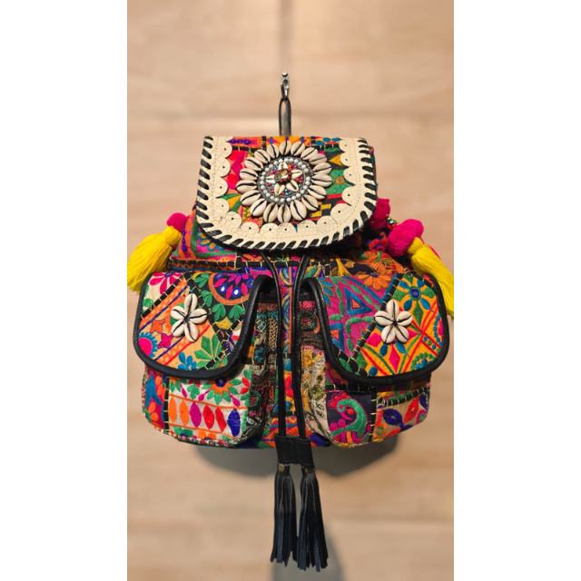 กระเป๋าเป้ปักลายโบฮีเมียนทำมือ – กระเป๋าเป้สะพายหลังลายชนเผ่าสีสันสดใสพร้อมงานปะติดแบบดั้งเดิมของชาวบันจารา