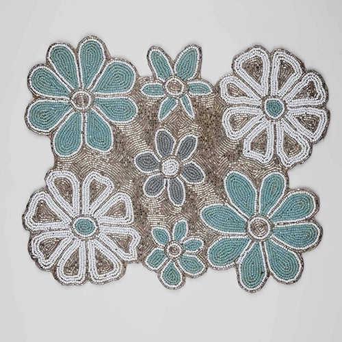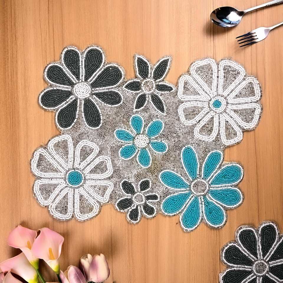 แผ่นรองจานรูปดอกไม้ประดับลูกปัดสไตล์โบฮีเมียนทำมือ ขนาด 13x16 นิ้ว ผลิตจากผ้าซาตินเป็นมิตรกับสิ่งแวดล้อม แผ่นรองจานหรูหราสไตล์ยุโรป