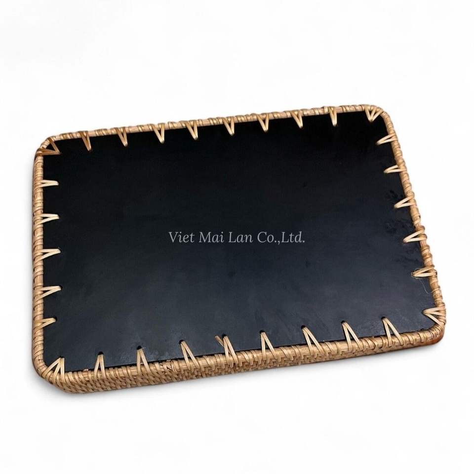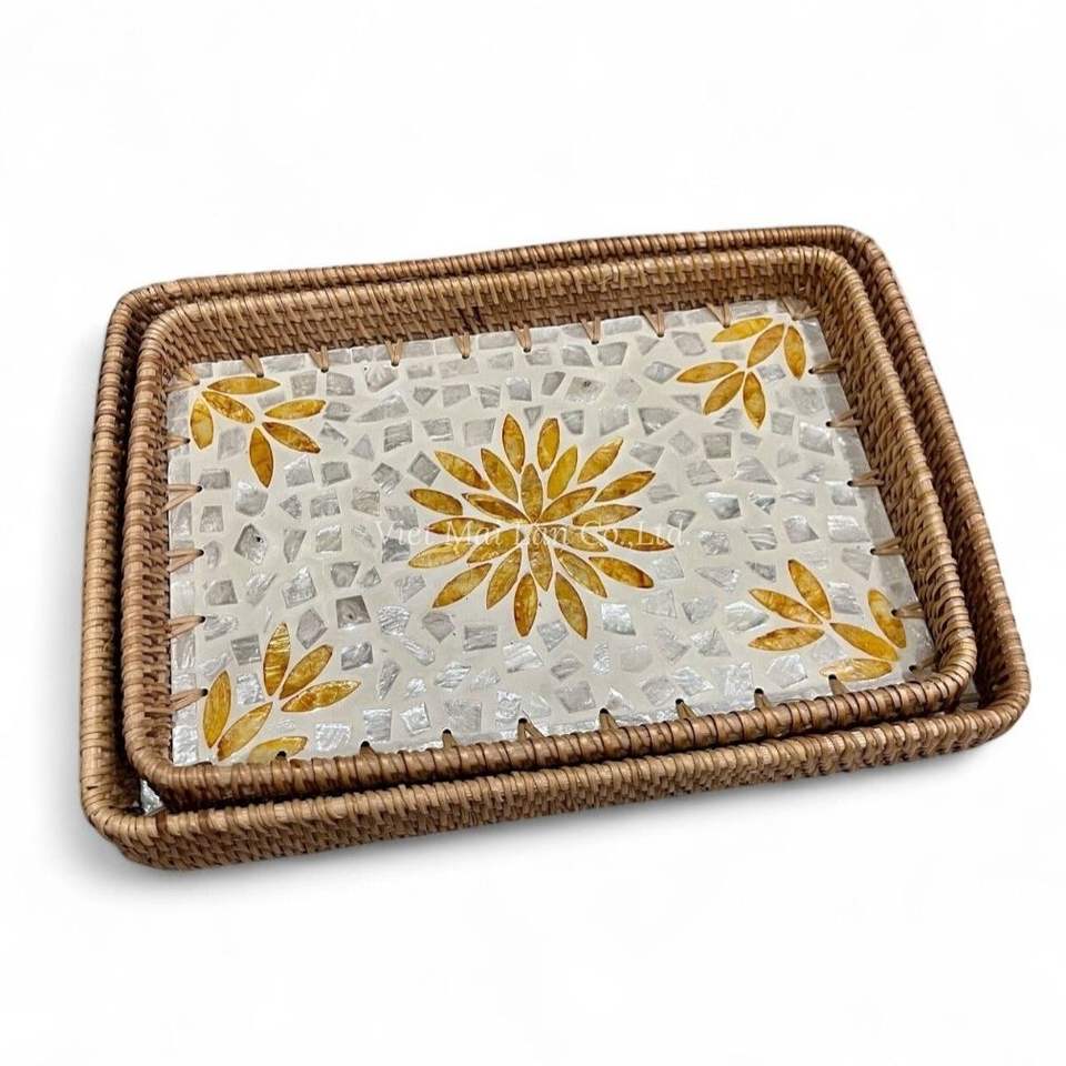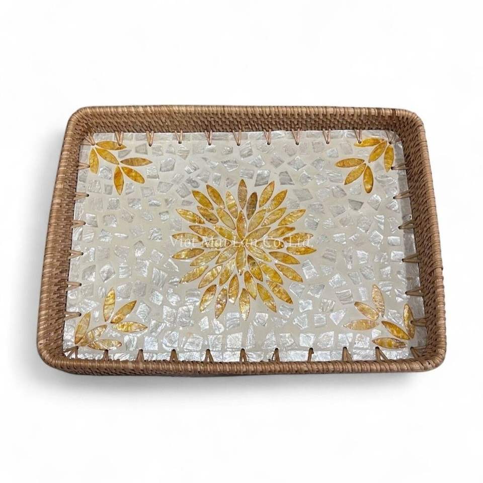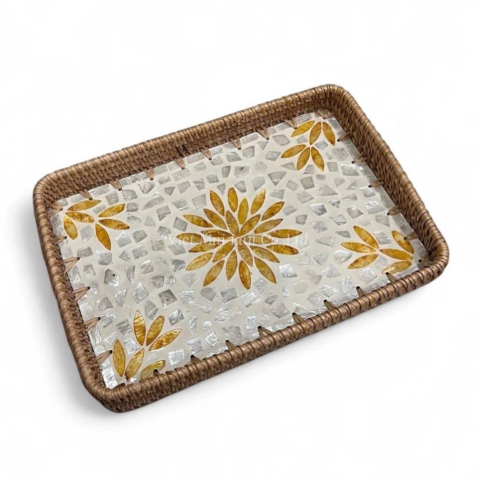 ถาดตกแต่งสไตล์โบฮีเมียนทำมือจากหวายฝังเปลือกหอยมุก ดีไซน์ยืดหยุ่น เป็นมิตรกับสิ่งแวดล้อม เหมาะสำหรับใช้บนโต๊ะในบ้าน