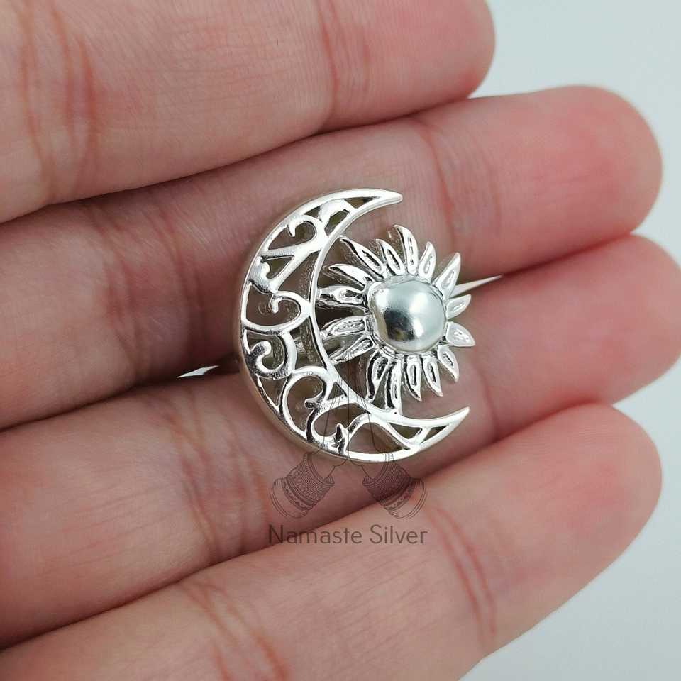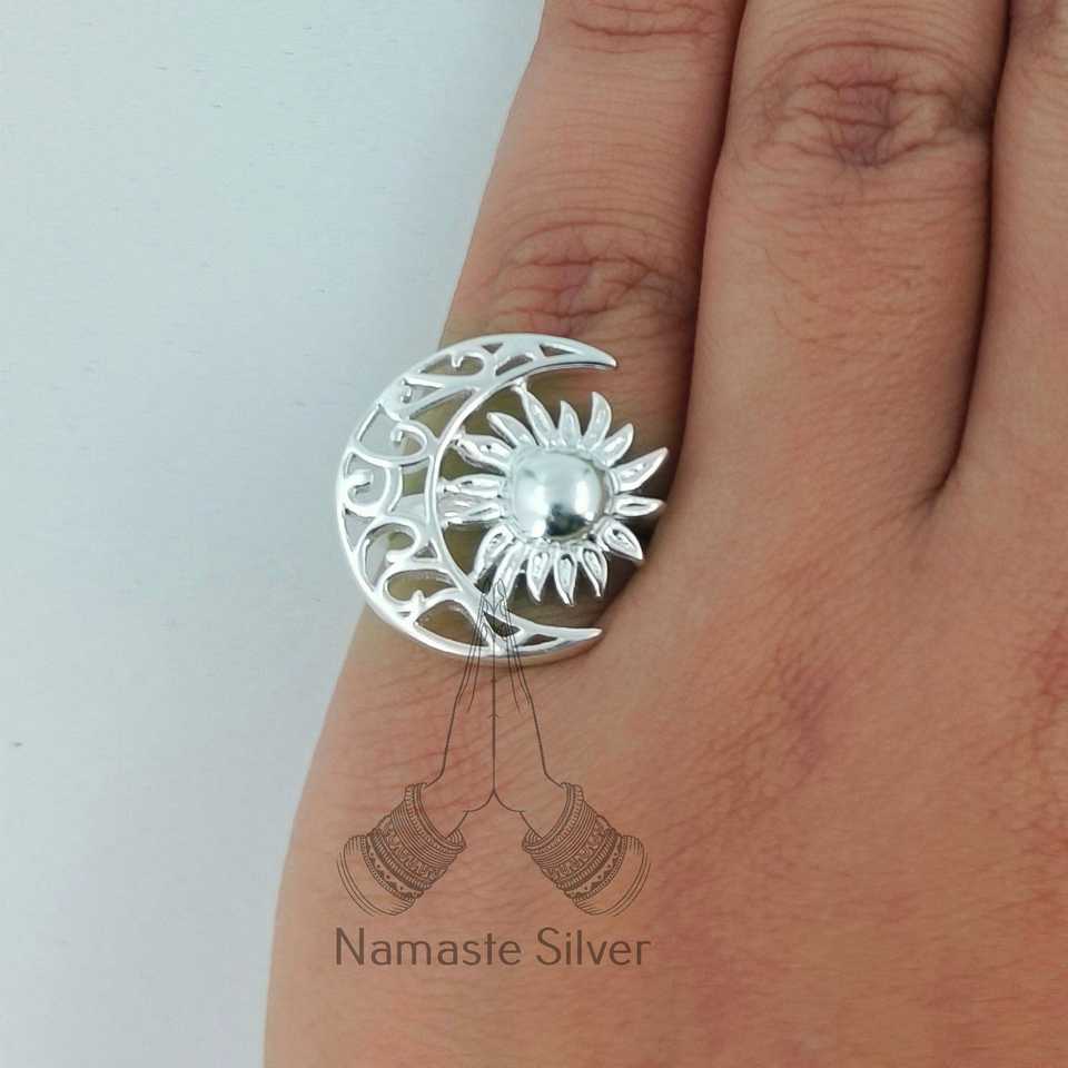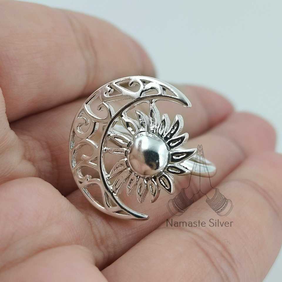 แหวนเงินแท้ 925 ทำมือสไตล์โบโฮ ลายพระอาทิตย์และพระจันทร์ เครื่องประดับสวรรค์ ของขวัญสำหรับเธอ แหวนเงินรูปพระจันทร์เสี้ยวประดับโอปอล