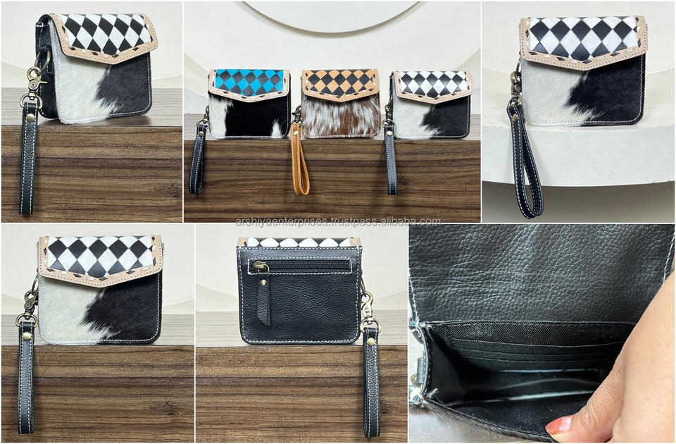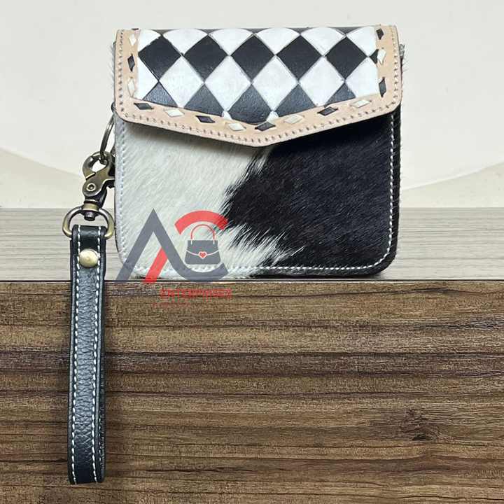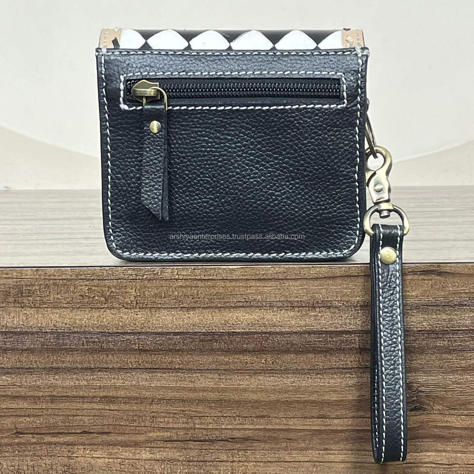 กระเป๋าใส่เหรียญหนังวัวแท้สไตล์โบฮีเมียนทำมือ ลายตารางหมากรุกแบบตะวันตก กระเป๋าสตางค์ใบเล็ก กระเป๋าคลัทช์ขนาดเล็ก พร้อมสายคล้องข้อมือ