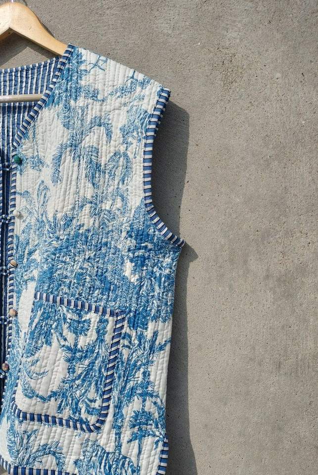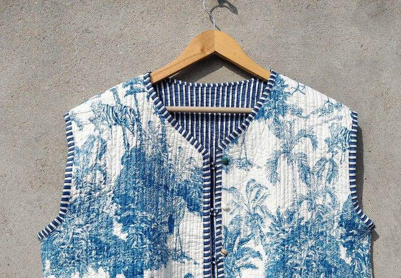 เสื้อแจ็กเก็ตผ้านวมสไตล์โบฮีเมียนของผู้หญิงเสื้อโค้ทผ้าทอแขนลายทางลำลองสีฟ้าขาววินเทจสำหรับฤดูหนาว