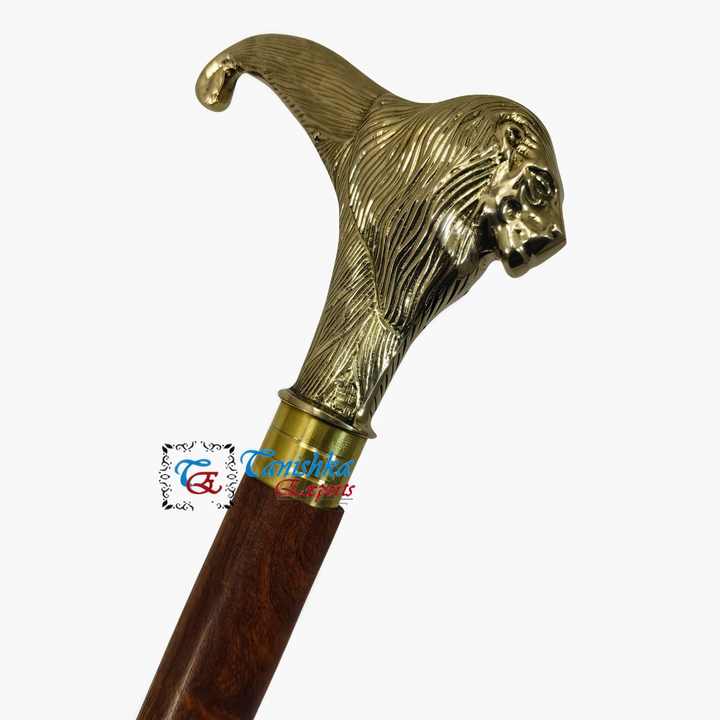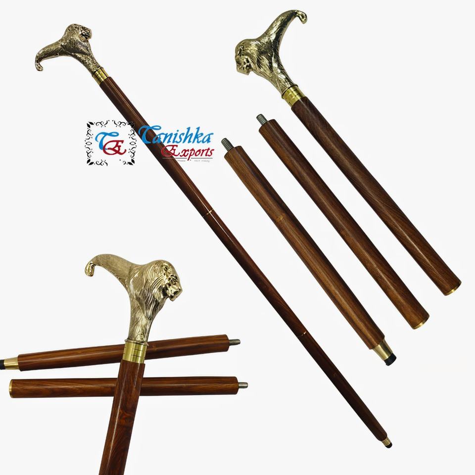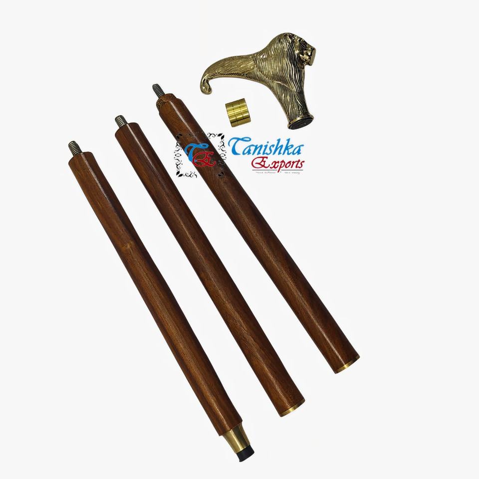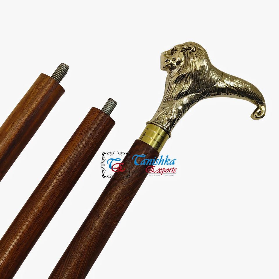 ไม้เท้าพับได้ทำมือ ด้ามจับหัวสิงโตทองเหลืองขัดเงา ไม้สีน้ำตาล ดีไซน์อาร์ตเดโค ความยาว 99 ซม. สำหรับใช้งานกลางแจ้ง