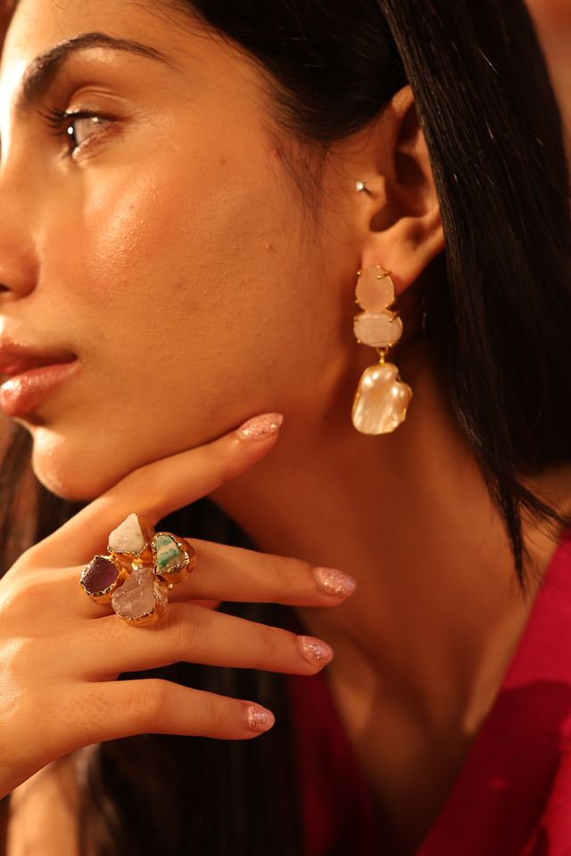 ต่างหูไข่มุกควอตซ์ทองเหลืองทำด้วยมือต่างหูแบบห้อยสำหรับผู้หญิงต่างหูแบบห้อยสไตล์พื้นเมืองสำหรับงานเลี้ยง