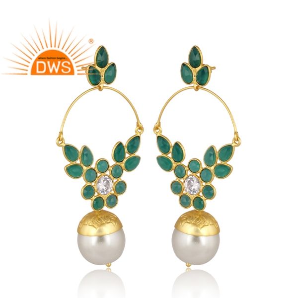 ชุดเครื่องประดับทำด้วยมือทองเหลืองธรรมชาติ CZ สีเขียวและชุดหินมุกต่างหูแบบห้อยสำหรับผู้หญิงแบบดั้งเดิม
