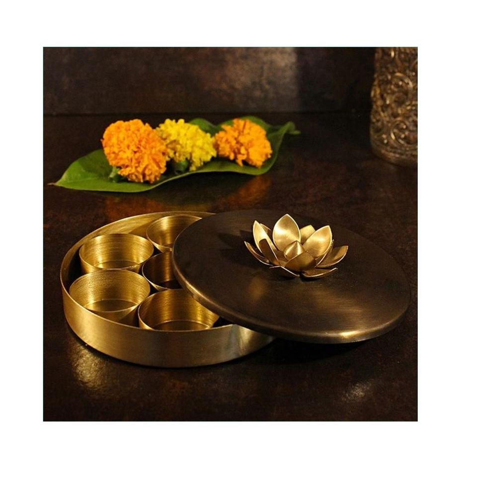 กล่องเครื่องเทศทองเหลืองทำมือ รุ่นมาซาลา ดัน พร้อมภาชนะ 7 ชิ้น และฝาปิดแกะสลักลายดอกไม้ประณีต - ชุดอุปกรณ์จัดระเบียบครัวแบบอินเดียดั้งเดิม