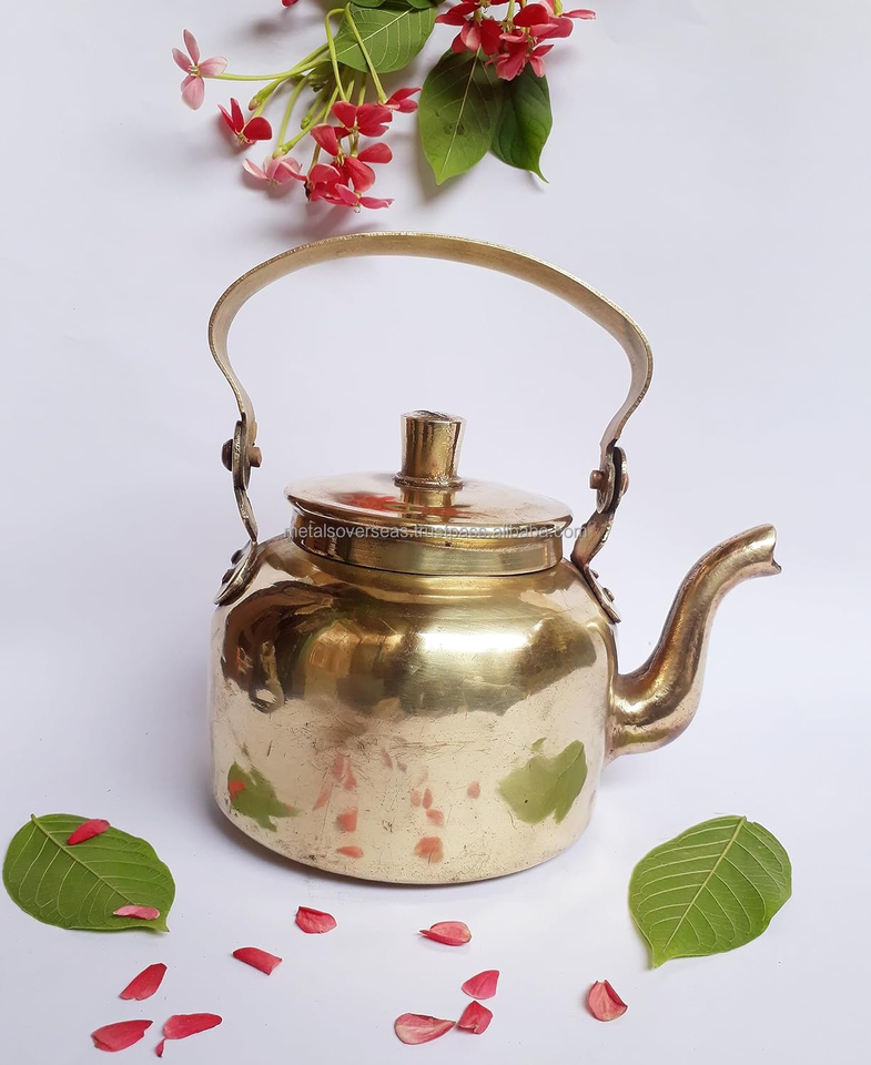 กาต้มน้ำชาทองเหลืองทำด้วยมือสำหรับห้องครัวอินเดียแบบดั้งเดิมกาต้มน้ำทองเหลืองแบบโบราณพร้อมที่จับสำหรับกาแฟชา