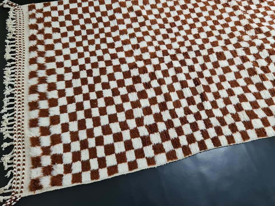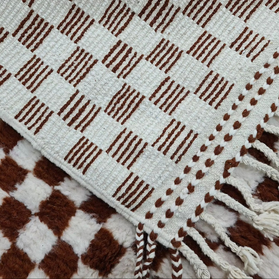 พรมขนสัตว์สีน้ำตาลเบนิโอะริเนียมแฮนด์เมดพรมโมรอคโคลายตารางหมากรุกสำหรับตกแต่งบ้านคริสมาสต์
