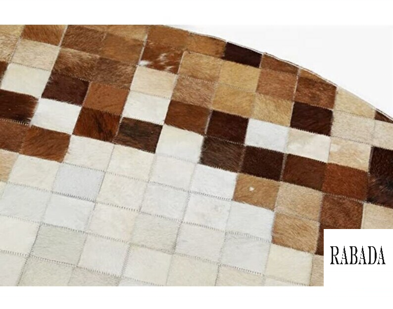 พรมหนังวัวแท้ทำมือ สีน้ำตาลขาว ทรงกลม ลายปะติด สำหรับปูพื้นห้องละหมาด