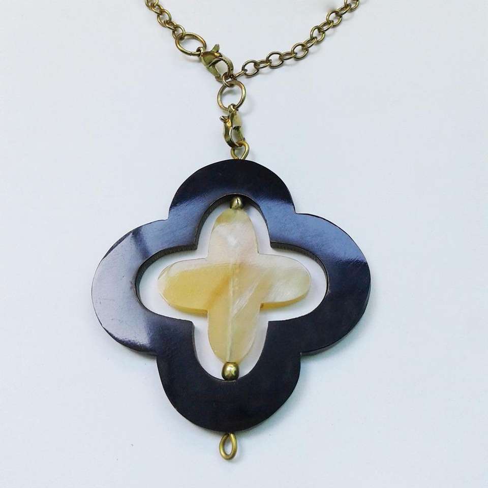สร้อยคอจี้รูปใบโคลเวอร์สี่แฉกทำจากเขาควายแท้ - รูปทรงกากบาทพร้อมจุดกลางสีครีมบนโซ่ทองเหลืองโบราณ