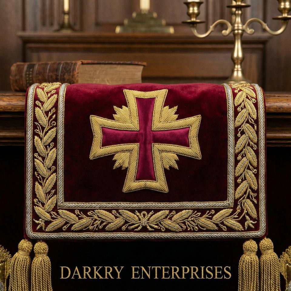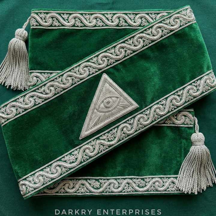สายสะพายกำมะหยี่สีเขียวปักด้วยด้ายทองคำแท้ ทำด้วยมือ สำหรับสมาชิกสมาคมเมสัน พร้อมตราสัญลักษณ์ดวงตาที่มองเห็นทุกสิ่ง และพู่ห้อยสีเงิน