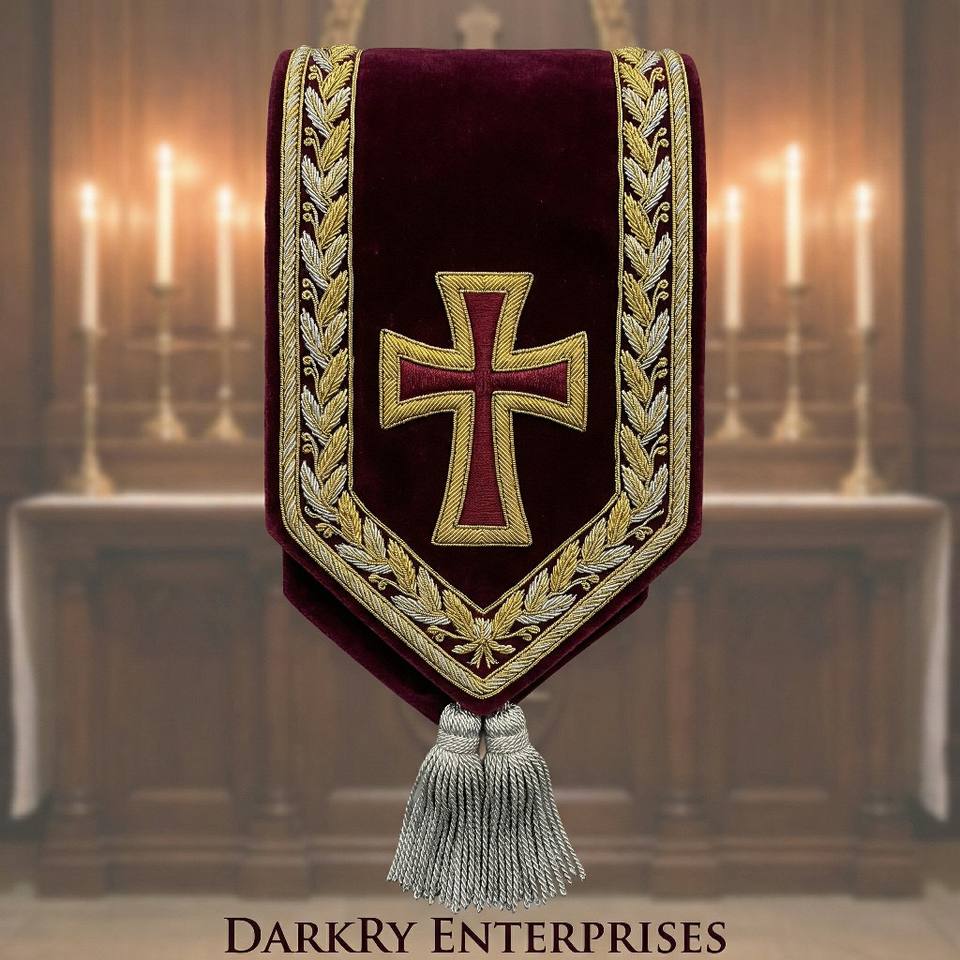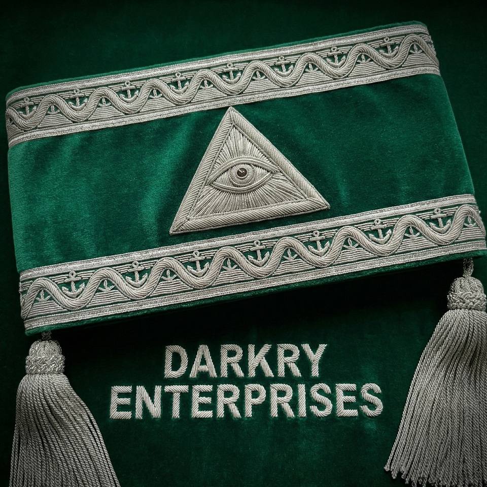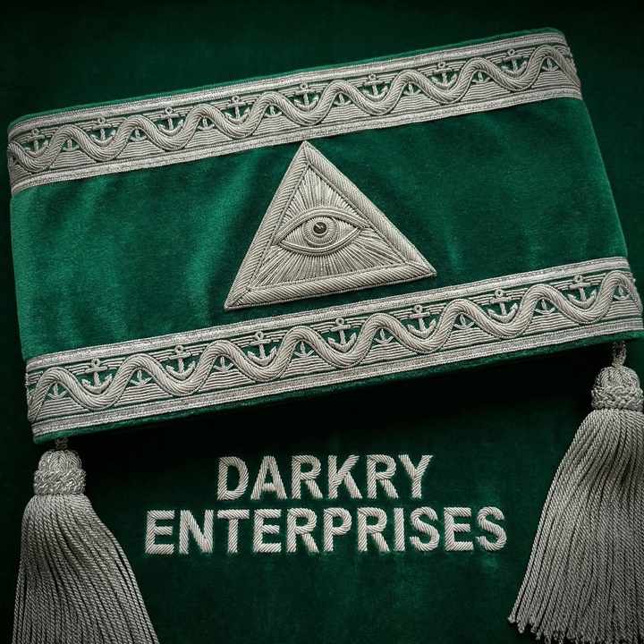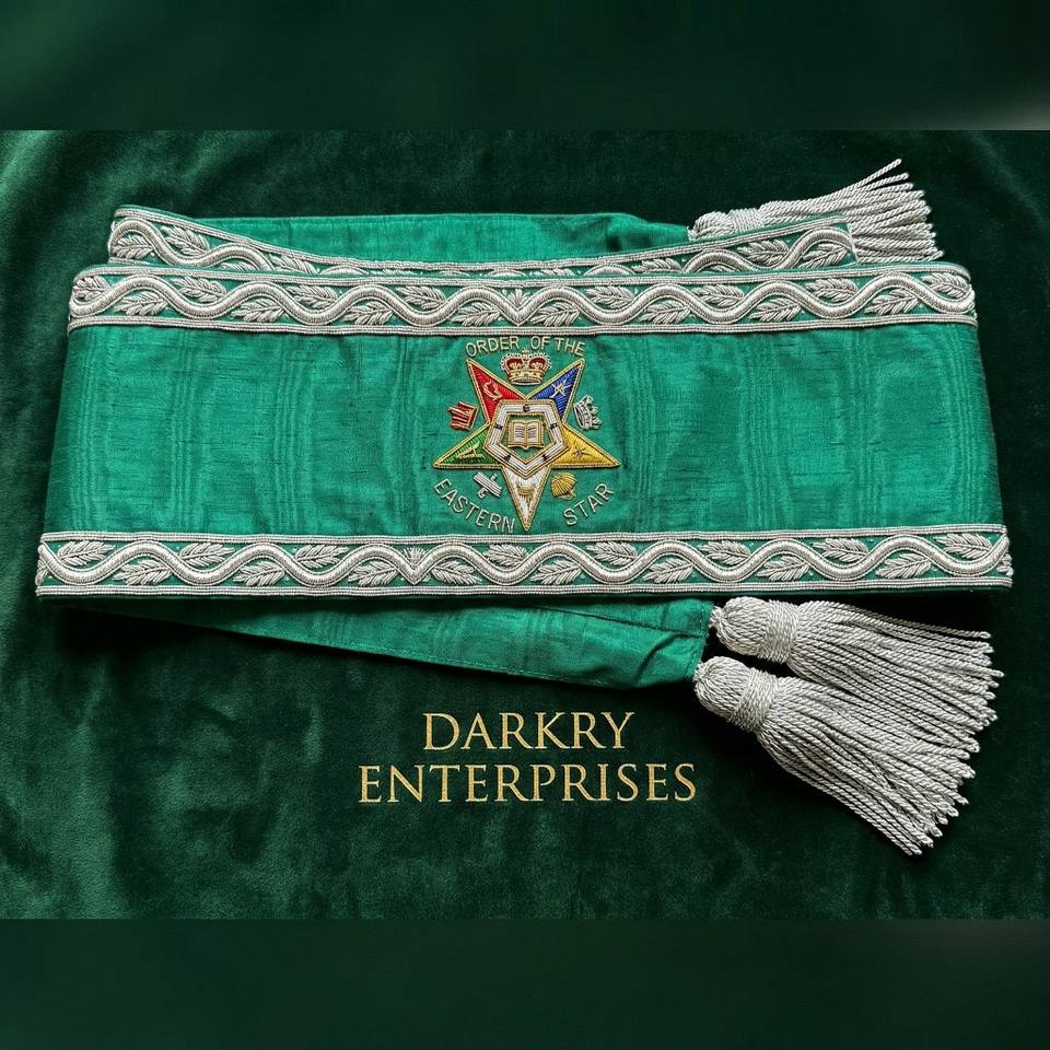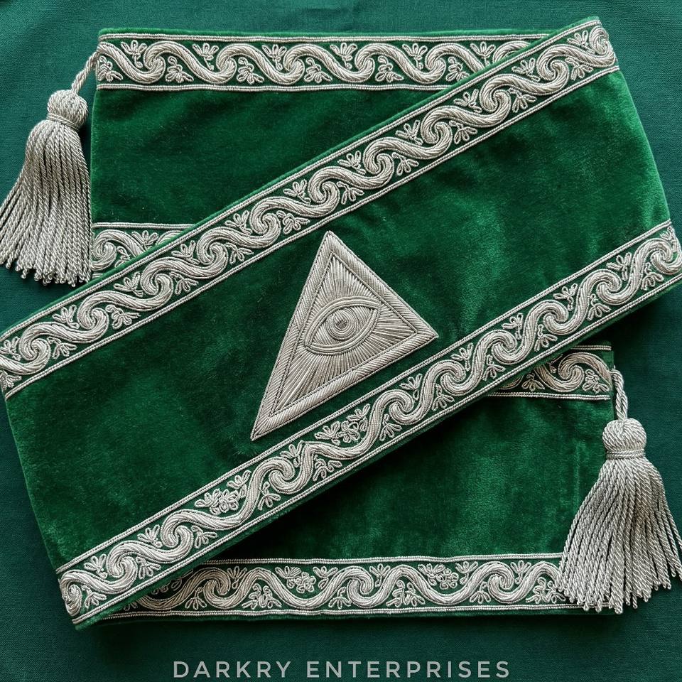 สายสะพายกำมะหยี่สีเขียวปักด้วยด้ายทองคำแท้ ทำด้วยมือ สำหรับสมาชิกสมาคมเมสัน สายสะพายสัญลักษณ์ดวงตาที่มองเห็นทุกสิ่ง พร้อมพู่ห้อยสีเงิน