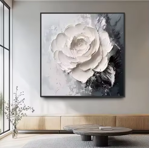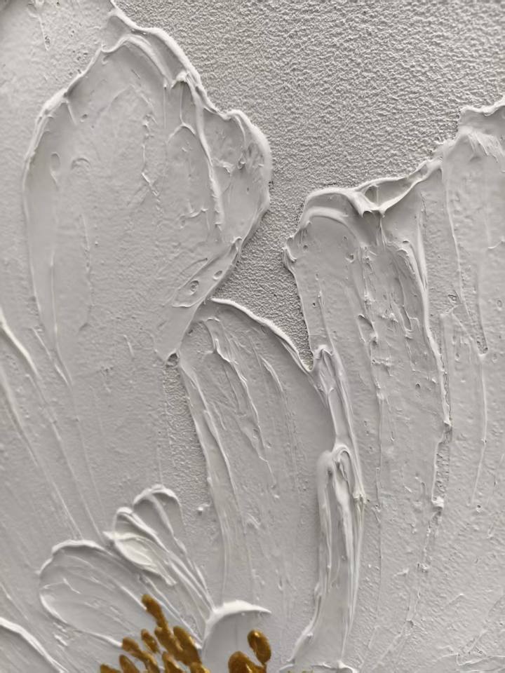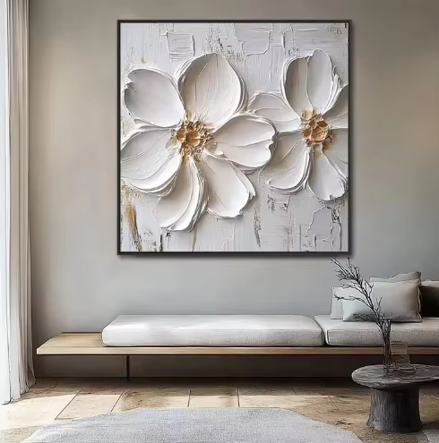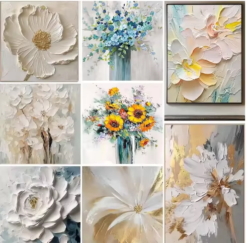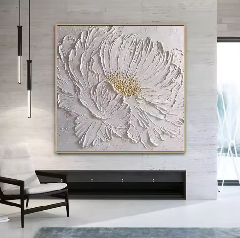 งานศิลปะตกแต่งผนังแบบแฮนด์เมดบนผ้าใบสีขาว ภาพวาดดอกไม้แบบนามธรรม 3 มิติ