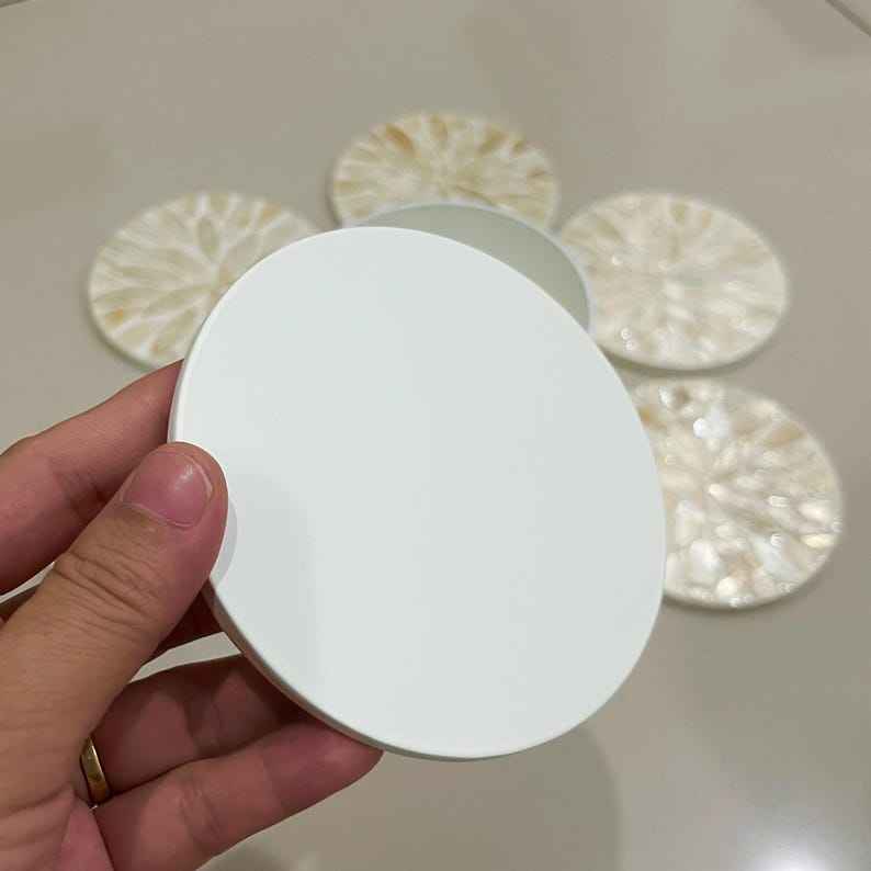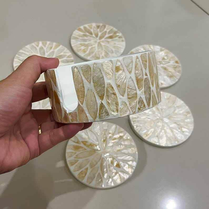 ชุดที่รองแก้วเปลือกหอยทำด้วยมือลายใบไม้สีทองและสีขาว