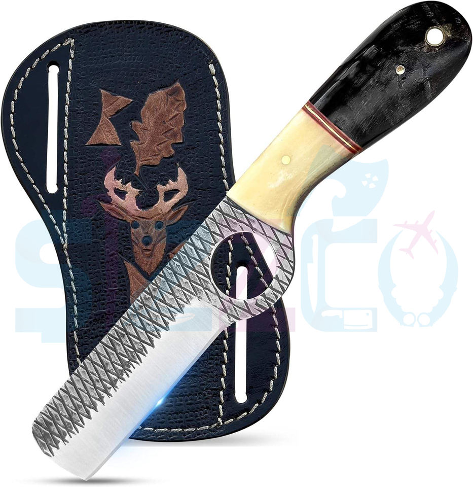 มีดตัดวัวเหล็กกล้าคาร์บอนทำมือ, มีดล่าสัตว์และตั้งแคมป์ใบมีดคงที่พร้อมปลอกหนัง – สไตล์คาวบอยแบบสั่งทำพิเศษ