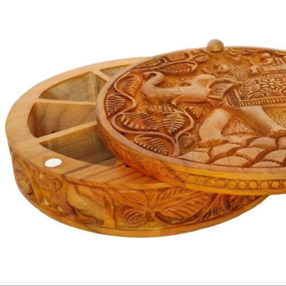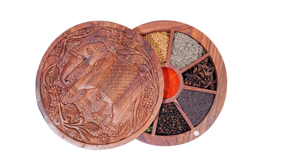 กล่องเครื่องเทศทำจากไม้แกะสลักทำด้วยมือพร้อมที่จับทองเหลืองสำหรับปรุงรสและเก็บสมุนไพร