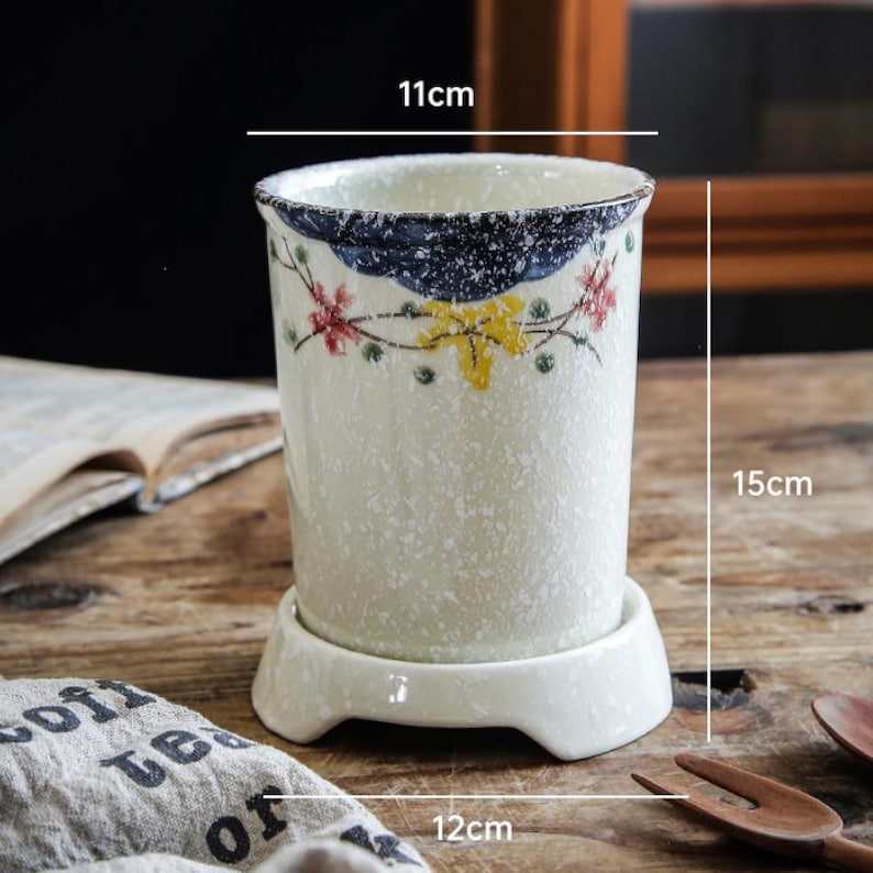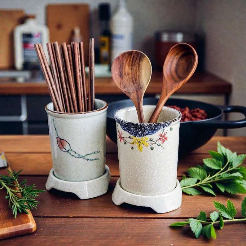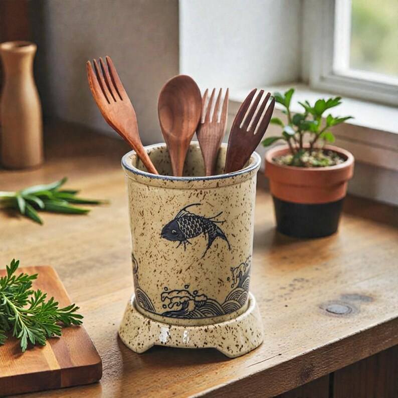 ที่ใส่เครื่องครัวเซรามิกทำมือ | กระปุกเก็บช้อนอุปกรณ์ครัว | เครื่องล้างจาน/ไมโครเวฟ/เตาอบที่เป็นมิตรต่อสิ่งแวดล้อม | สง่างาม