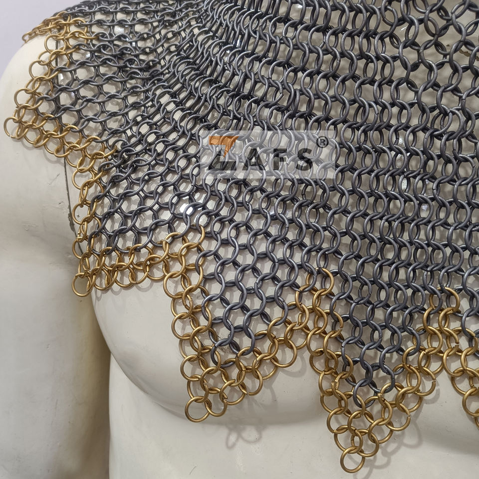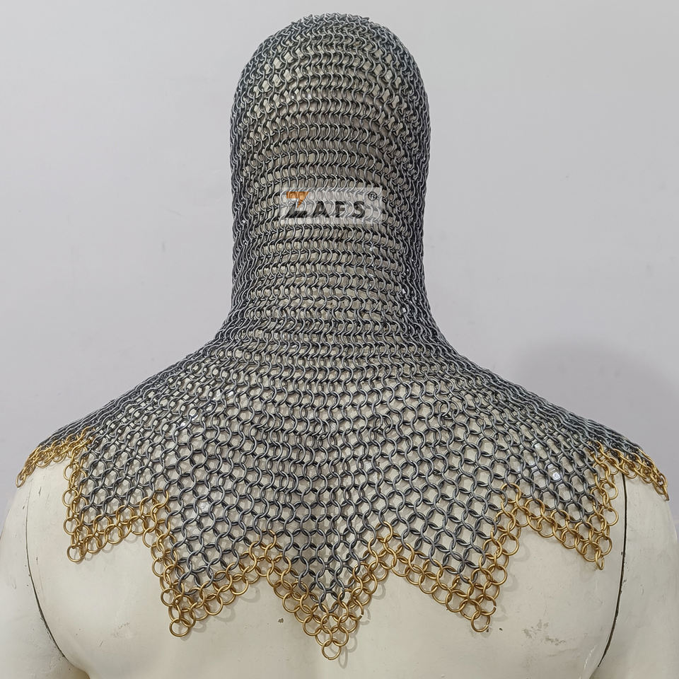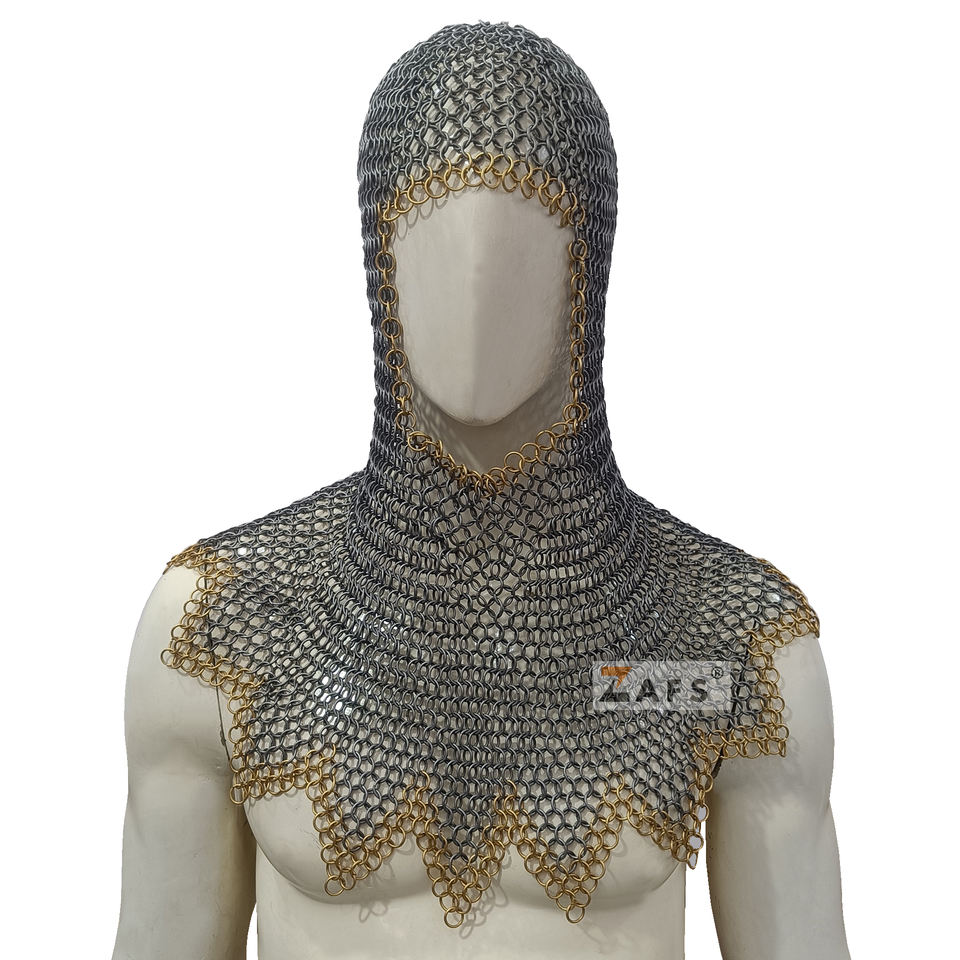 หมวกเหล็กถักมือทำพร้อมห่วงทองเหลือง ดีไซน์ซิกแซกเหล็กอ่อน ห่วงเชื่อมต่อกันแบบบัตต์ริง ชุดเกราะอัศวินสำหรับงานจำลองยุคกลาง