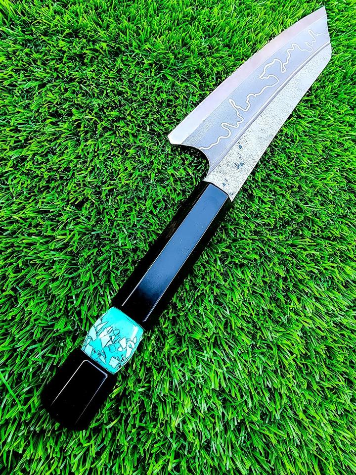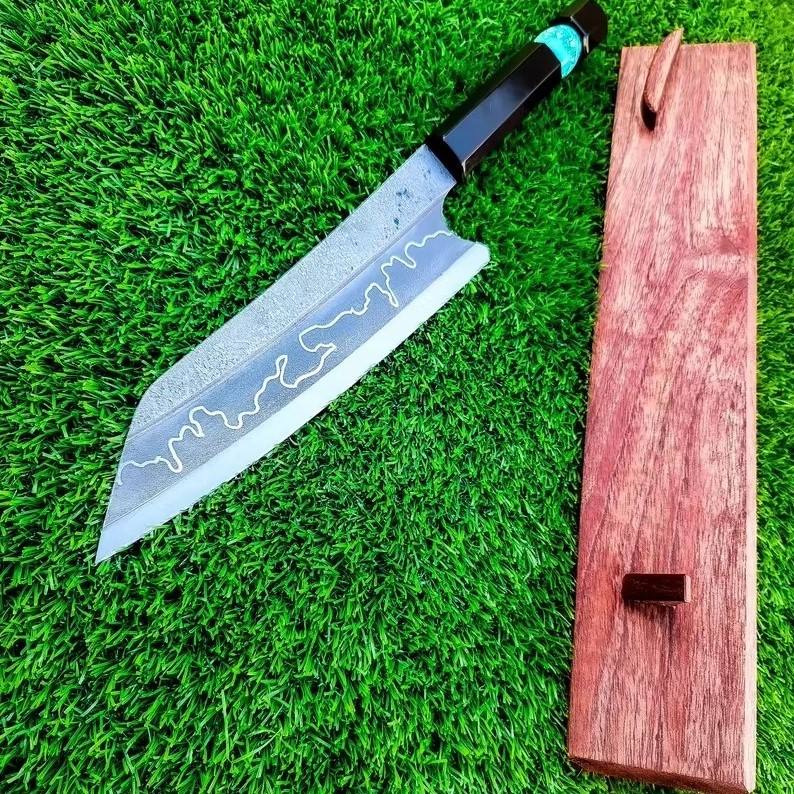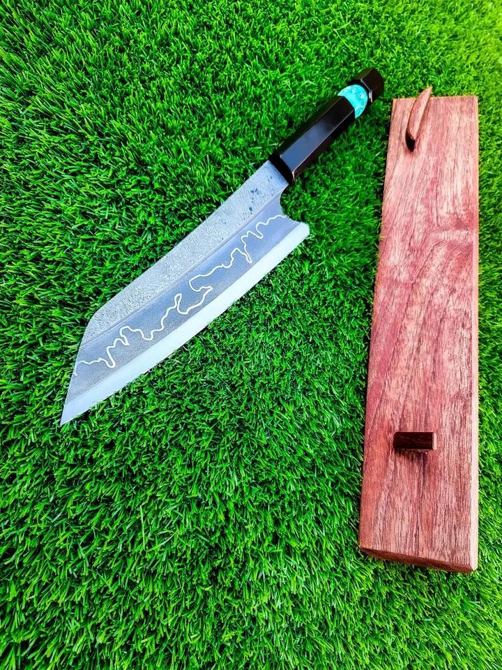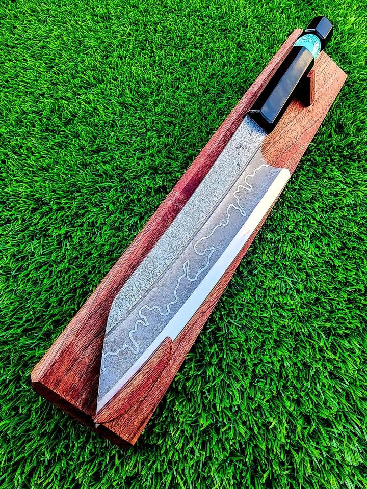 มีดเชฟทำมือ ใบมีดสลักลายสวยงาม ดีไซน์สวยงามและจับถนัดมือ มาพร้อมปลอกหนัง มีดสำหรับตั้งแคมป์และเอาตัวรอด