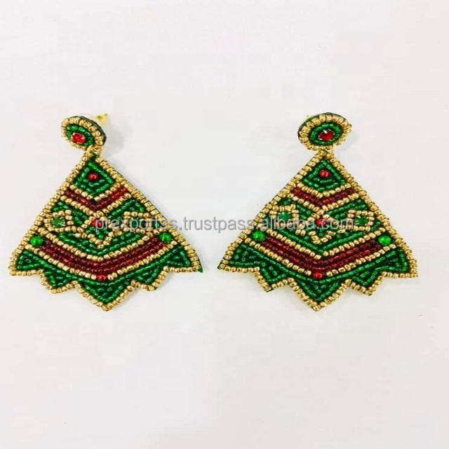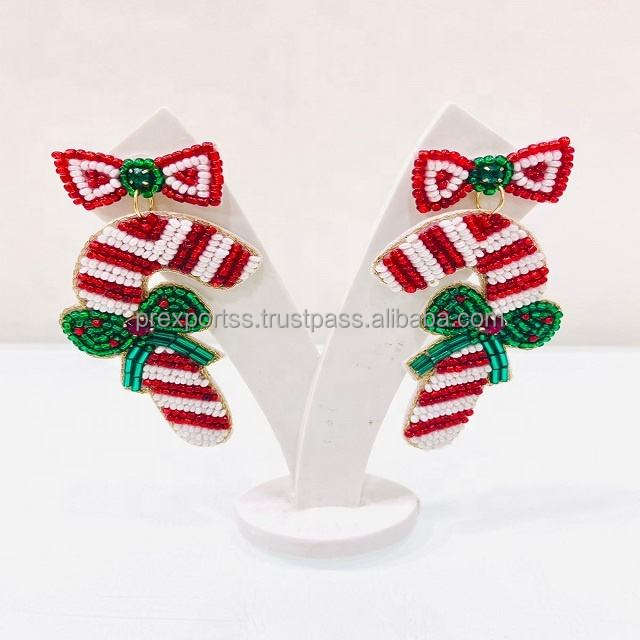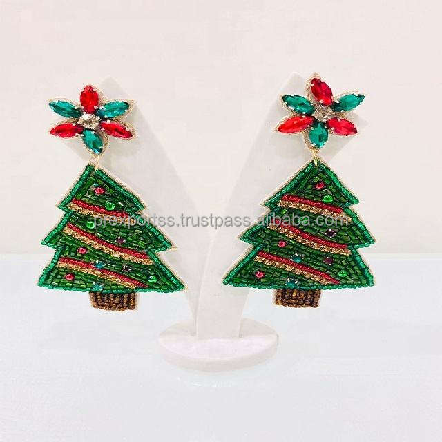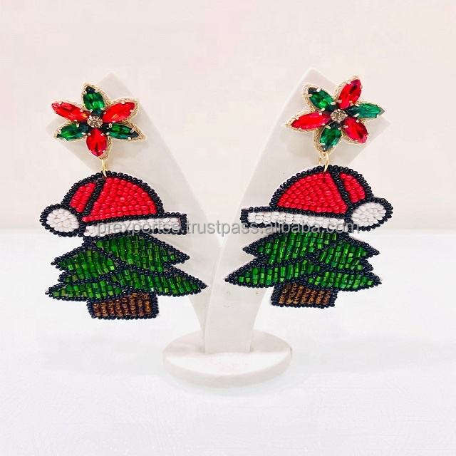 ต่างหูเม็ดลูกปัดรูปไม้คริสต์มาสสีแดงเขียว ดีไซน์โบว์ ของขวัญสไตล์โบฮีเมียนสำหรับเทศกาล งานปาร์ตี้ แฟชั่น