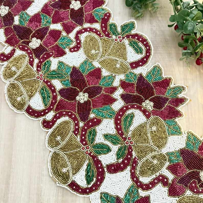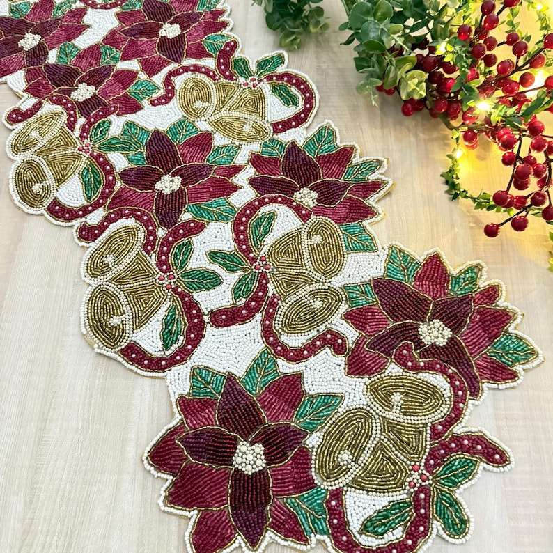 ผ้าปูโต๊ะคริสต์มาสทำด้วยมือ: เซ็ทลูกปัดลายดอกไม้ขนาด13X36นิ้ว