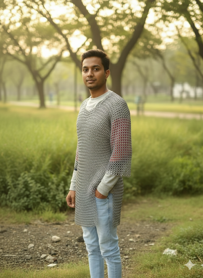 เสื้อเชนเมล์คลาสสิกทำมือสำหรับผู้ชาย แฟชั่นฮาวเบิร์กสีเงิน อลูมิเนียม ทูนิคสไตล์โกธิค สตรีทแวร์ คอสเพลย์ คอสตูม