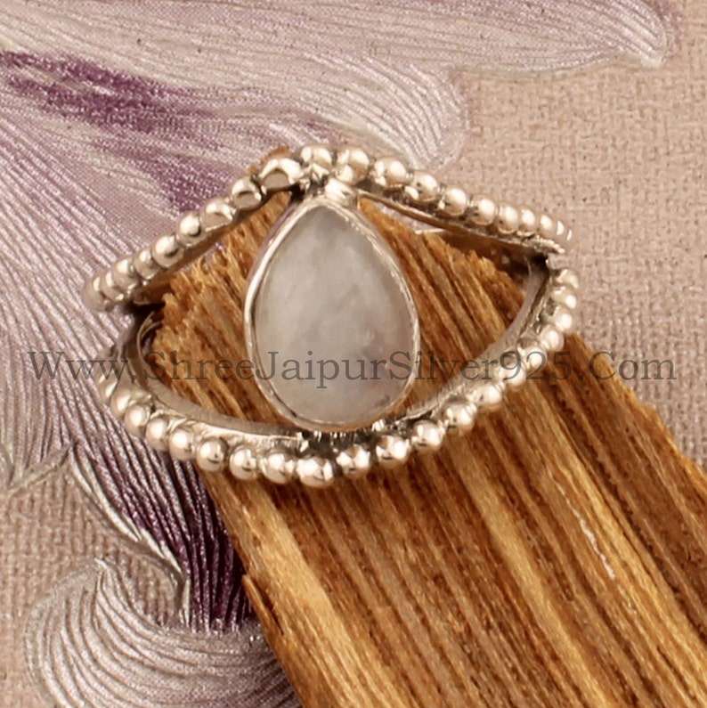 แหวนมูนสโตนสีรุ้งประดับลูกแพร์คลาสสิกทำด้วยมือ925สเตอร์ลิงเงินอัญมณีธรรมชาติสำหรับงานแต่งงานและปาร์ตี้ของขวัญครบรอบ