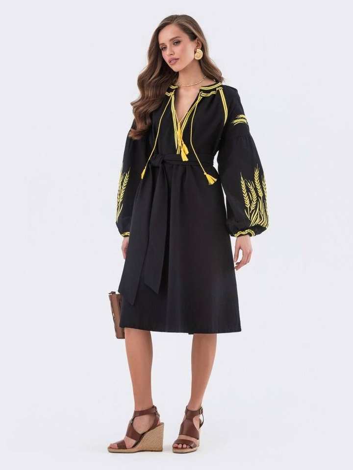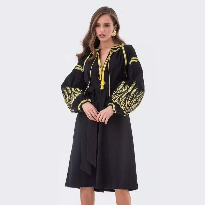 Handmade Classic Vyshyvanka Embroidery Vintage Velvet A-Line Dress Black Ukraine Women's Washable Ornaments Natural Waistline