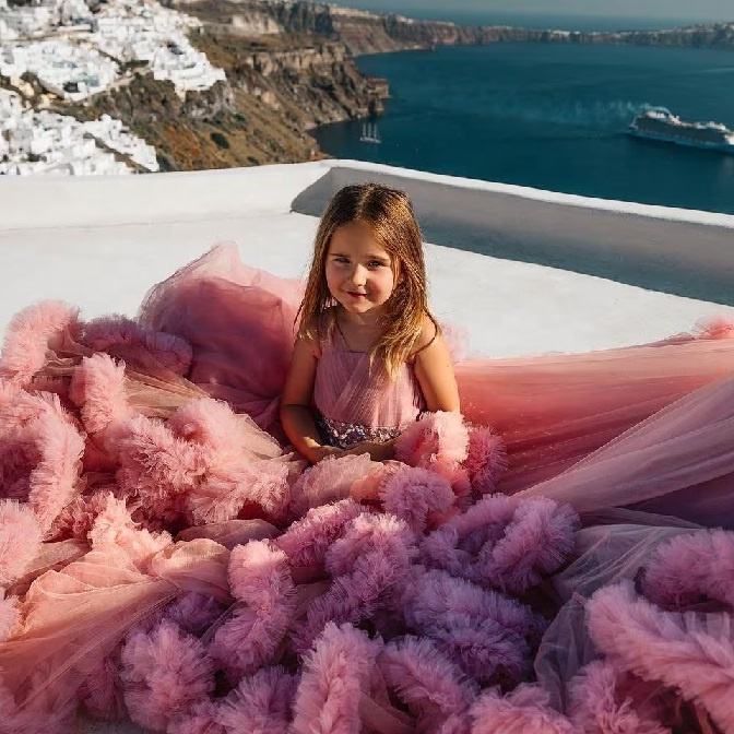 แฮนด์เมดเมฆยาว Santorini บินชุดผู้หญิงยาวการถ่ายภาพชุดเด็กชุดอาบน้ํา