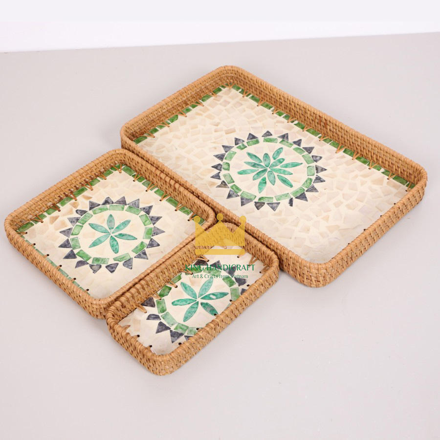 โต๊ะกาแฟทำมือถาดเสิร์ฟพร้อมถาดหวายสไตล์โบฮีเมียนสำหรับตกแต่งห้องครัวห้องนั่งเล่น