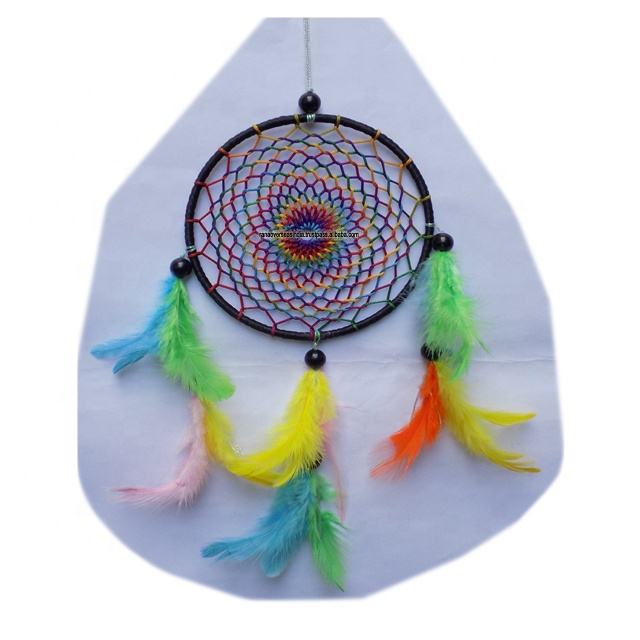 ที่ดักฝันแขวนผนังสีสันสดใสทำด้วยมือพร้อมขนนกและลูกปัดสำหรับตกแต่งระเบียง