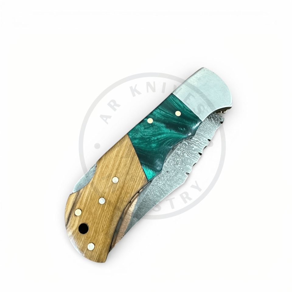 มีดพับทำมือจากทองแดงและสแตนเลสเกรดอุตสาหกรรม พร้อมโลโก้สั่งทำ ระบบล็อคด้านหลัง EDC รับประกัน 3 ปี ด้ามไม้เคลือบอีพ็อกซี่เรซิ่น