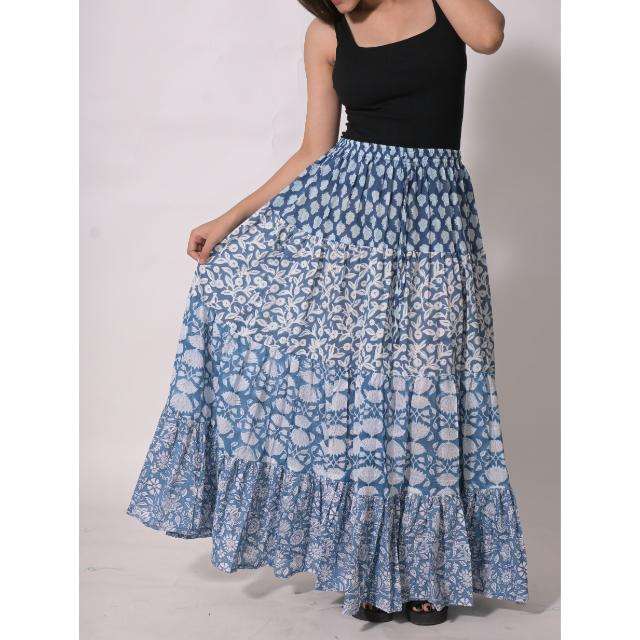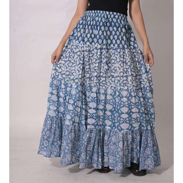 กระโปรงแม็กซี่ผ้าฝ้ายพิมพ์ลายบล็อกทำมือ กระโปรงยาวสไตล์โบฮีเมียนแบบปะติดปะต่อ เสื้อผ้าสำหรับงานเทศกาลของผู้หญิงชาวอินเดีย