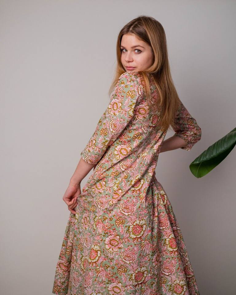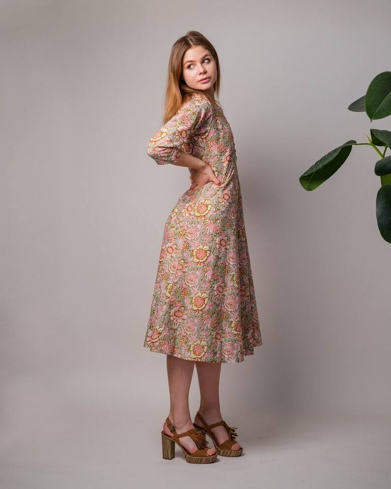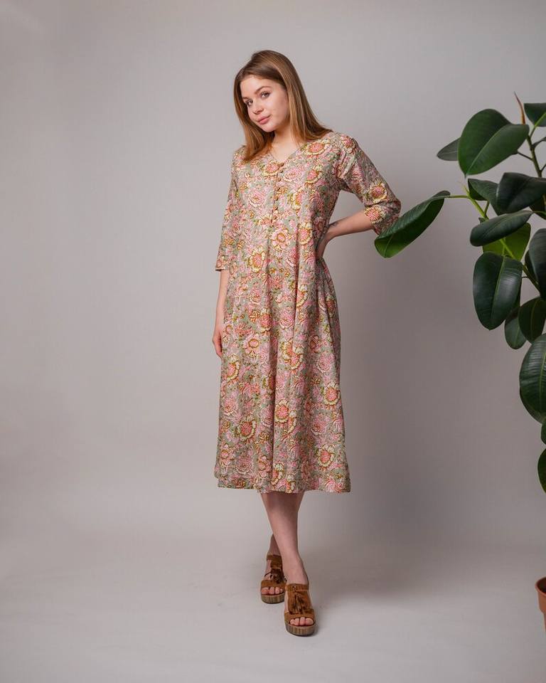 ชุดเดรสผ้าฝ้ายทำมือสไตล์โบโฮ พิมพ์ลายดอกไม้ด้วยมือ ความยาวระดับน่อง แฟชั่นที่เป็นมิตรต่อสิ่งแวดล้อม