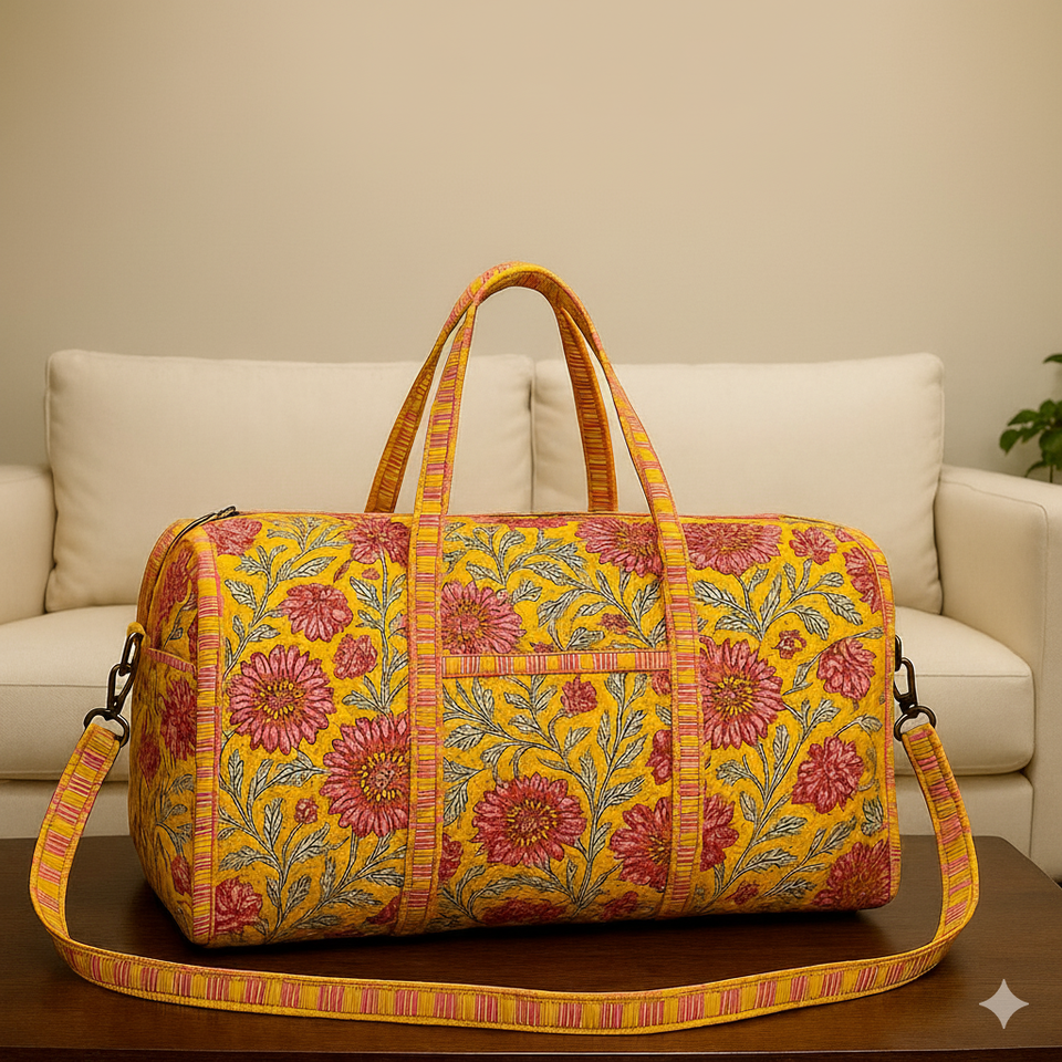 กระเป๋าผ้าคอตตอนทำด้วยมือทนทานเป็นมิตรกับสิ่งแวดล้อมกระเป๋ากีฬาวีคเอนเดอร์มีซิปปิดสีเหลืองลายดอกไม้ใส่ของได้เยอะการเดินทางสุดหรู