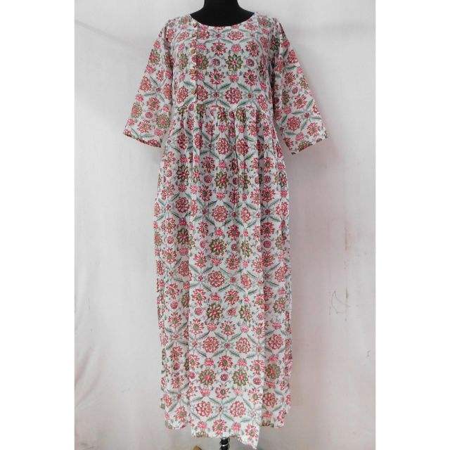 เดรสทูนิคแขนยาวผ้าฝ้ายทำมือสำหรับผู้หญิงเสื้อคลุมหลวมพิมพ์ลายวินเทจสามารถซักได้