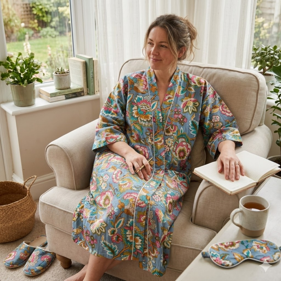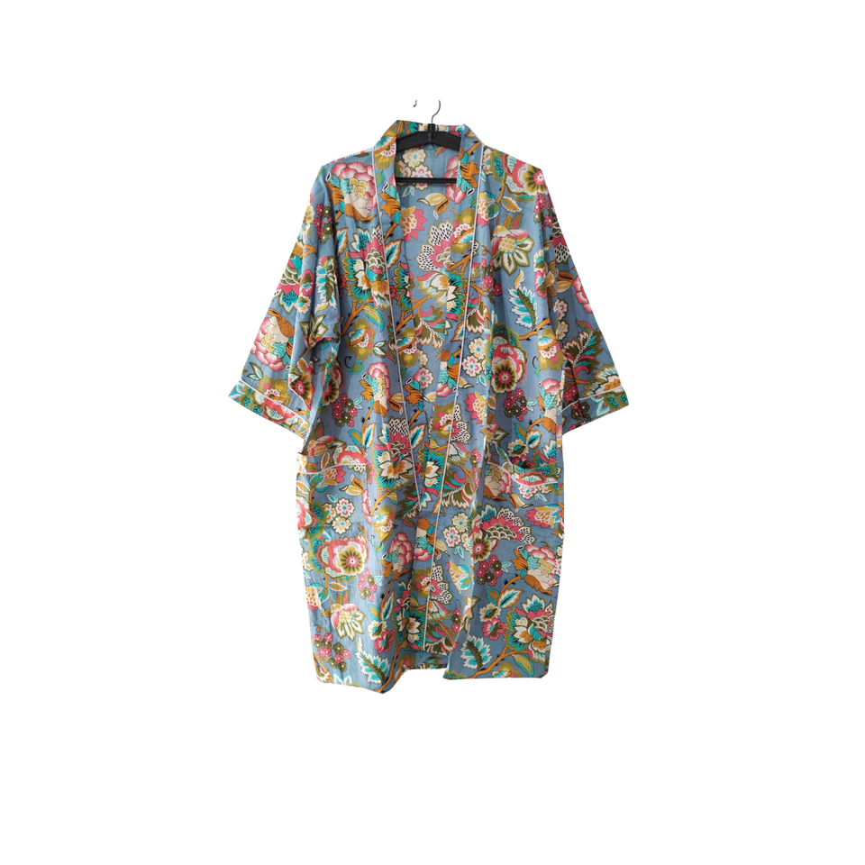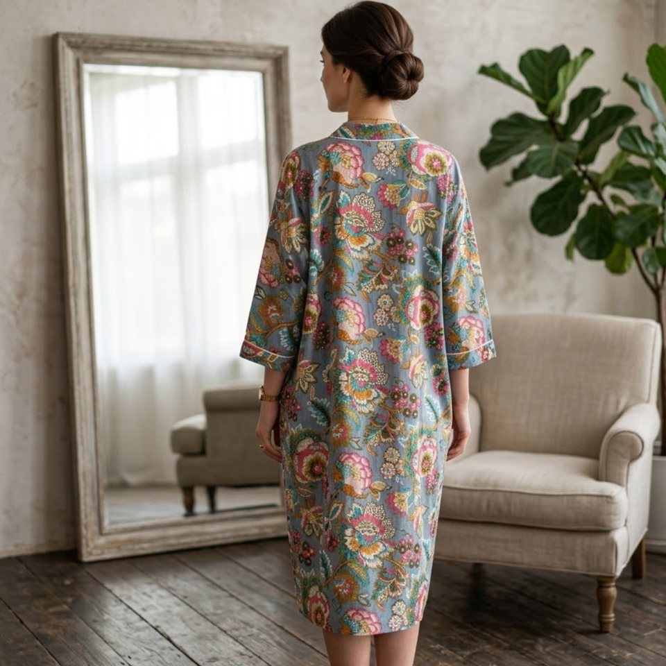 ชุดนอนผ้าฝ้ายทำมือลายดอกไม้สำหรับผู้หญิง เสื้อคลุมกิโมโนสีเทา คอวี แขนยาว มีกระเป๋าด้านหน้า ชุดลำลอง
