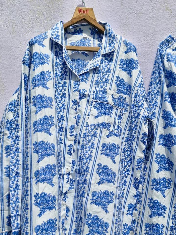 ชุดนอนผ้าฝ้ายทำมือพิมพ์ลายบล็อก (3 ชิ้น)