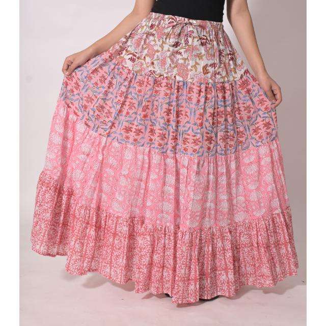 กระโปรงแม็กซี่ผ้าฝ้ายทำมือลายปะติดดอกไม้พิมพ์ลายบล็อกสไตล์โบฮีเมียนอินเดียสำหรับเทศกาลฤดูร้อนเอวธรรมชาติทรงพลีท