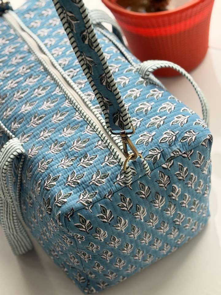 กระเป๋าผ้าฝ้ายเย็บมือ ทรงดัฟเฟิล น้ำหนักเบา ทนทาน ภายในกว้างขวาง ลายพิมพ์บล็อกทันสมัย เหมาะสำหรับการเดินทาง ฟิตเนส หรือวันหยุดสุดสัปดาห์