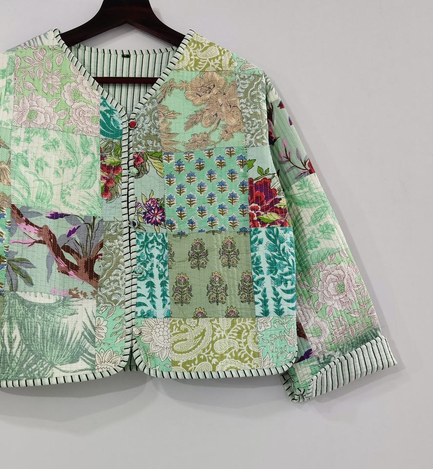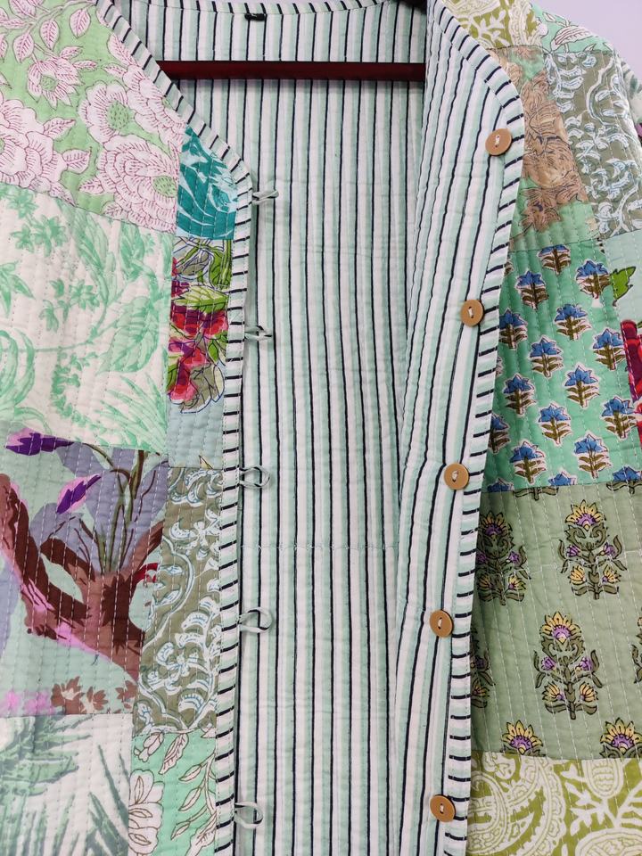 เสื้อแจ็กเก็ตผ้าฝ้ายเย็บปะต่อสไตล์โบฮีเมียนของผู้หญิงเสื้อโค้ทตัวยาวแบบลำลองแบบกระดุมด้านหน้า