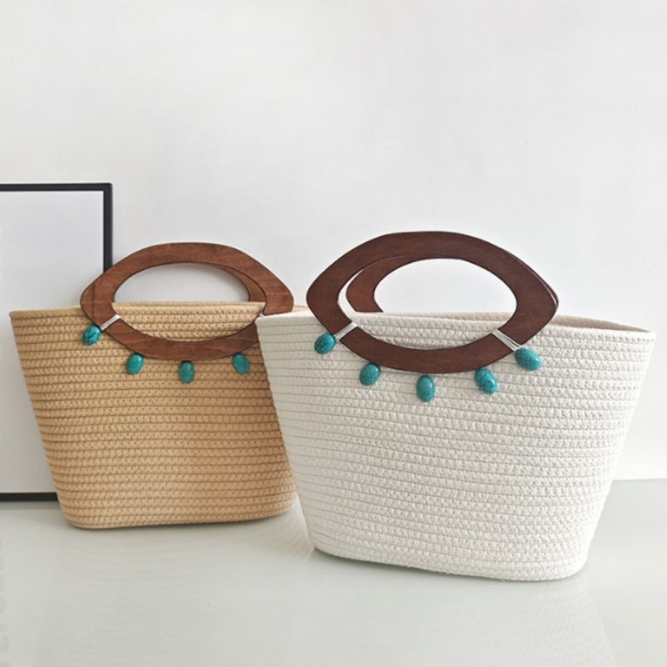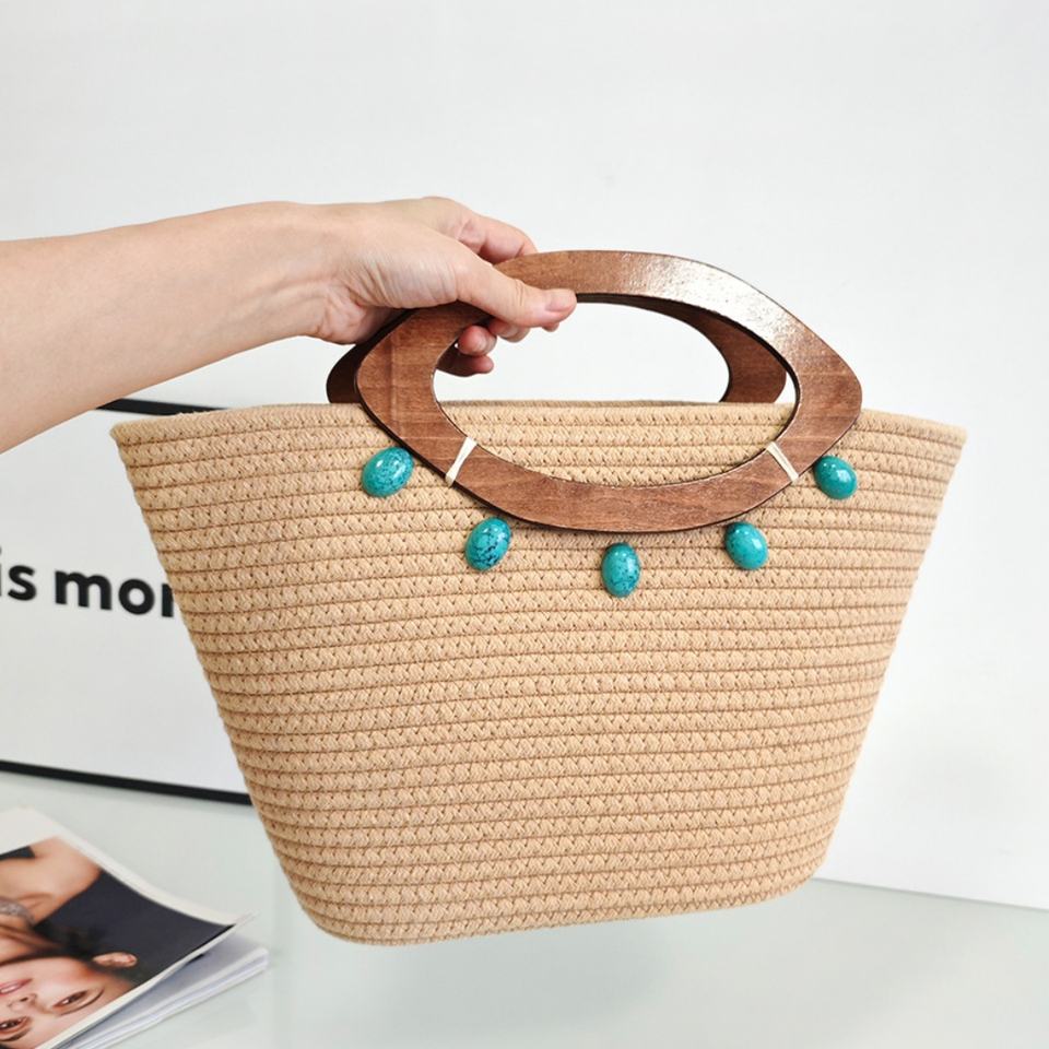 กระเป๋าผ้าฝ้ายถักทำมือ แฟชั่น กระเป๋าสะพายขนาดใหญ่เก๋ไก๋ พร้อมหูจับไม้สไตล์วินเทจ ประดับลูกปัดสีฟ้าคราม