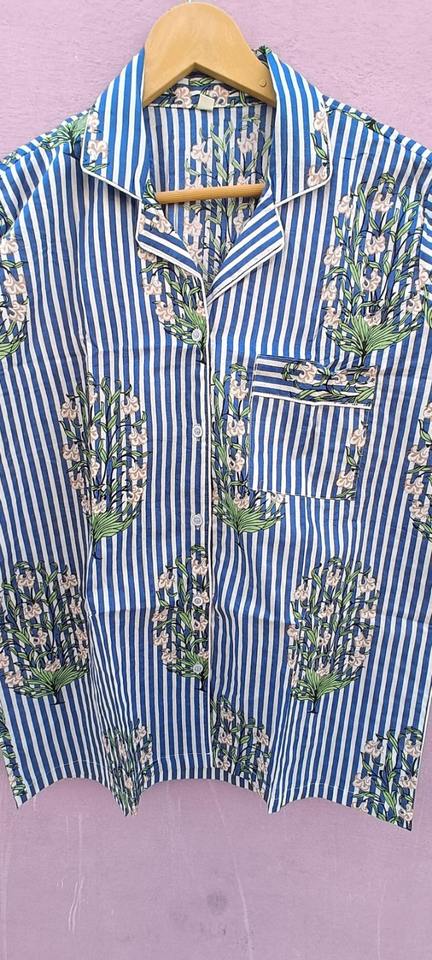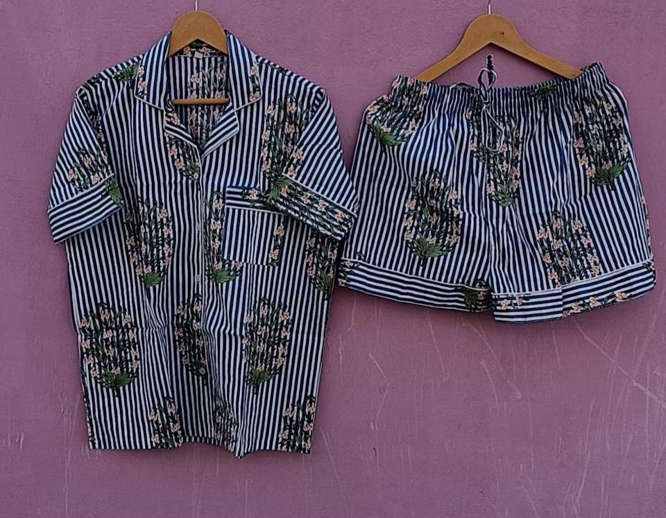ชุดนอนผ้าฝ้ายลายทางทำมือสำหรับผู้หญิง ลายดอกไม้ แขนสั้น กางเกงขาสั้น ชุดนอนลำลอง ชุดนอน ชุดนอนคริสต์มาส