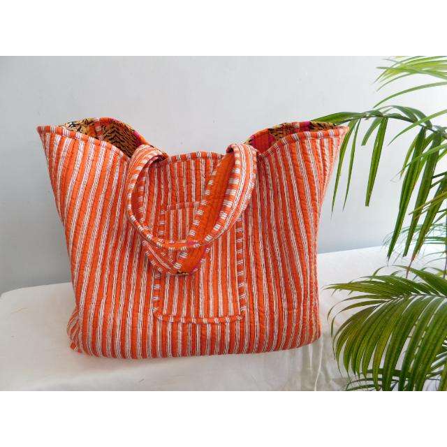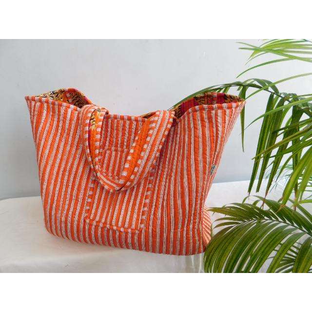 กระเป๋าผ้าฝ้ายลายทางทำมือพร้อมซิปปิด ทรงโบโฮสไตล์อินเดีย กระเป๋าช้อปปิ้งนำกลับมาใช้ใหม่ได้ จากรัฐราชสถาน โดย SR Exports
