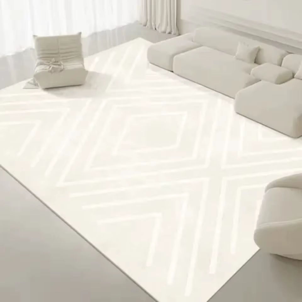 พรมผ้าคอตตอนสีขาวแบบแอบสแตรกทำมือสำหรับตกแต่งห้องรับแขกดีไซน์แบบลูปตัดต่ำสำหรับสัตว์เลี้ยงซักได้สำหรับตกแต่งห้องนั่งเล่น1