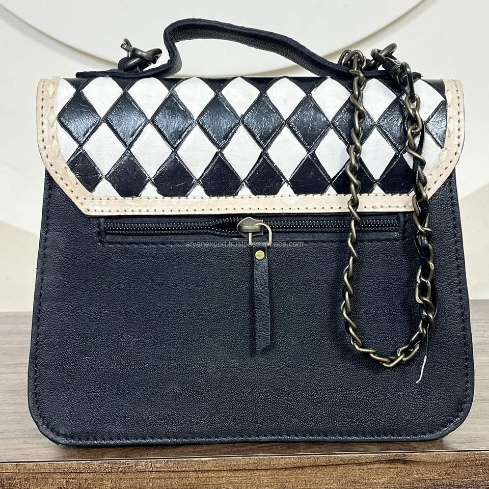 กระเป๋าสะพายพาดลำตัวหนังวัวทำด้วยมือกระเป๋าสะพายไหล่แบบเปิดไหล่ลายหมากรุกพร้อมสายโซ่มีสไตล์และทนทาน