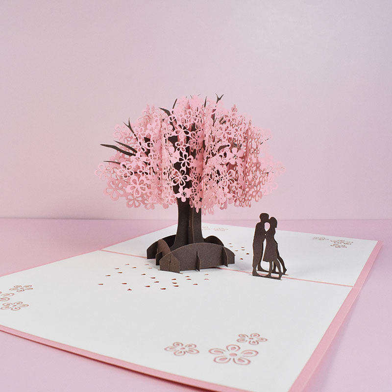 การ์ดป๊อปอัพดอกซากุระทำมือ งานสร้างสรรค์ พิมพ์ 3 มิติ ด้วย UV ปั๊มทอง ตัดด้วยเลเซอร์ ของขวัญงานฝีมือกระดาษ สำหรับวันเกิดและวันวาเลนไทน์