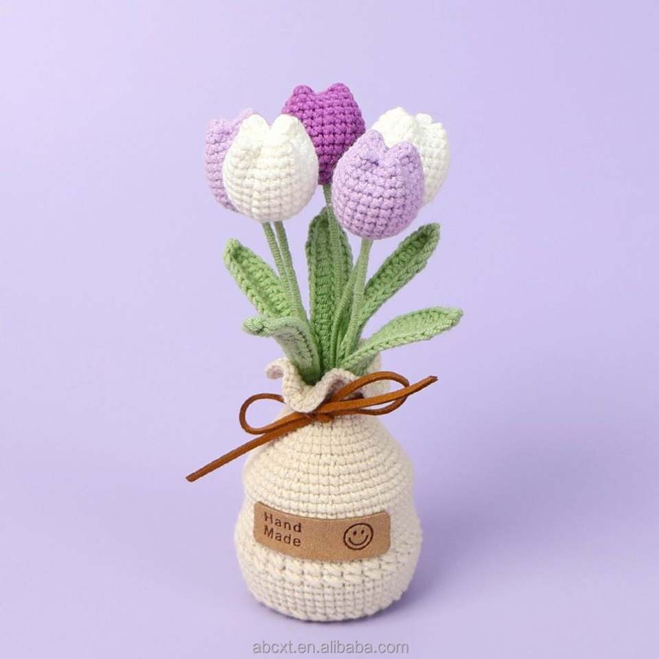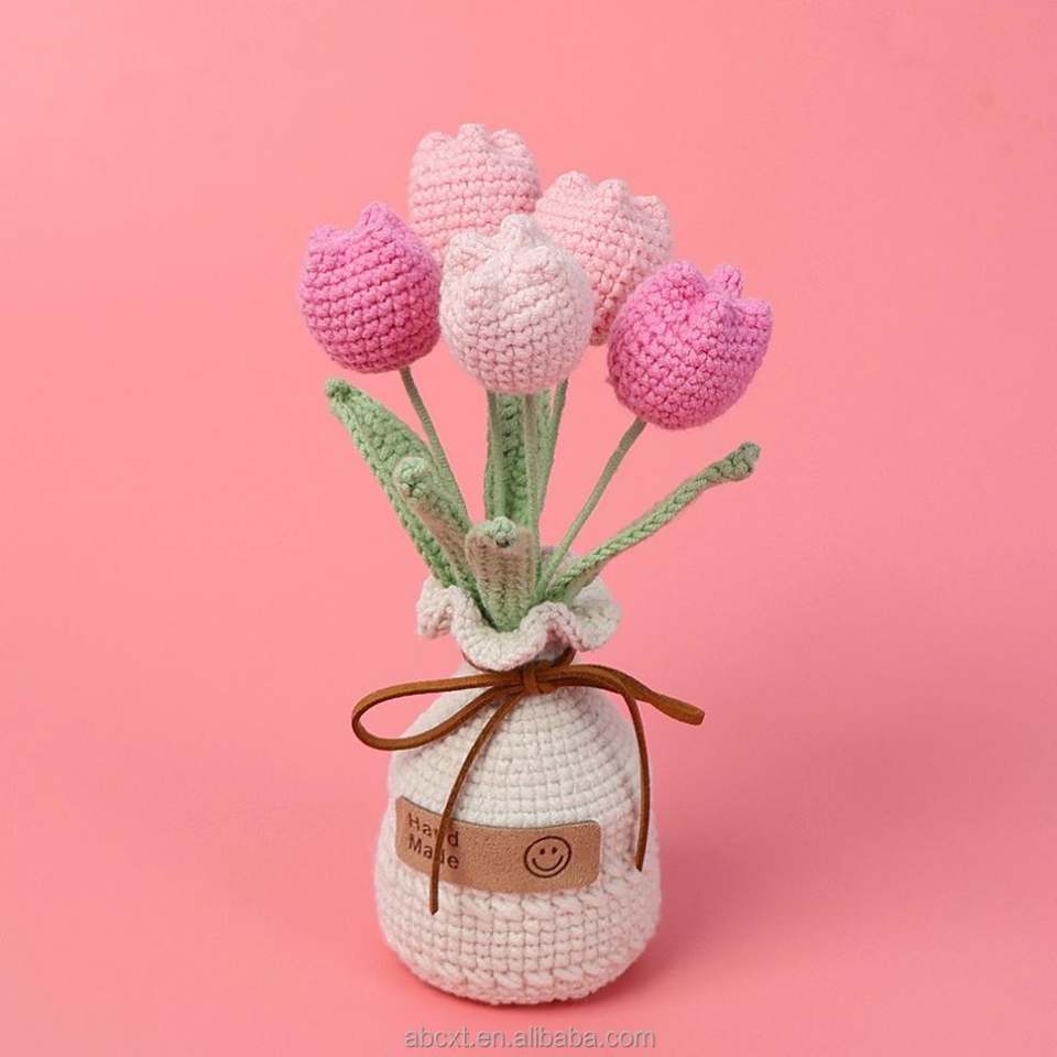 กระถางดอกทิวลิปโครเชต์ทำมือ ถักจากไหมพรม ดอกไม้ประดิษฐ์สำหรับตกแต่งรถยนต์ โต๊ะทำงาน สำหรับวันฮาโลวีน วันรับปริญญา วันพ่อ